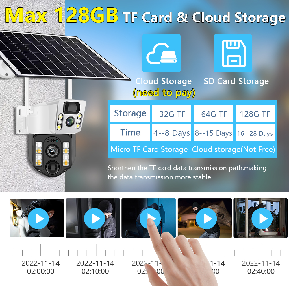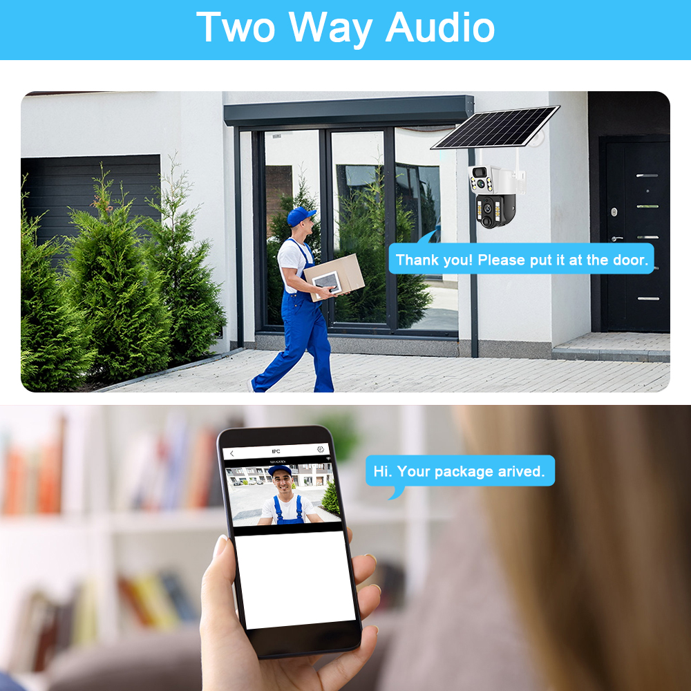 Наша Солнечная камера наблюдения встроена в Большую батарею емкостью 10000 мАч и имеет функцию солнечной зарядки для достижения 180 дней сверхдлительного режима ожидания, предоставляя вам Экологичное и эффективное решение для наблюдения. Будь то в отдаленных районах, местах без источника питания или местах с требованиями защиты окружающей среды, эта функция обеспечит вам непрерывную и бесперебойную защиту безопасности.