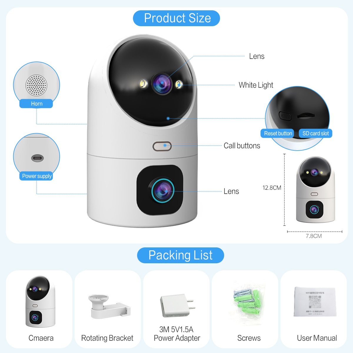 После обнаружения цели камера автоматически отрегулирует верхний объектив, отслеживая движущиеся объекты, автомобили, домашних животных, людей и отправляя Push-уведомления на ваш смартфон, убедитесь, что вы всегда первый, кто получает информацию, когда что-то происходит.
