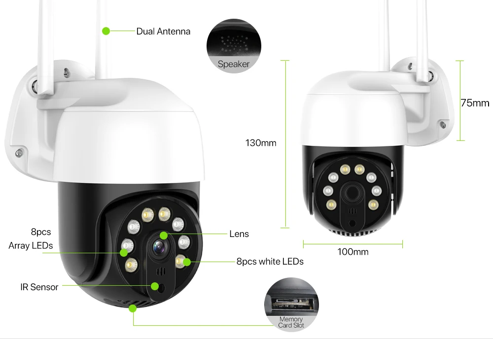 4 инфракрасных светодиода + 4 белых светодиода, показывающие вам четкие и красочные изображения днем/ночью;