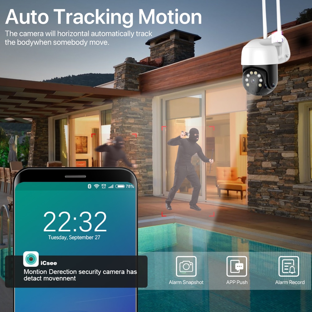 При обнаружении движения камера наблюдения немедленно запускает сигнал тревоги, отправляет оповещения и push-уведомления на ваше устройство.