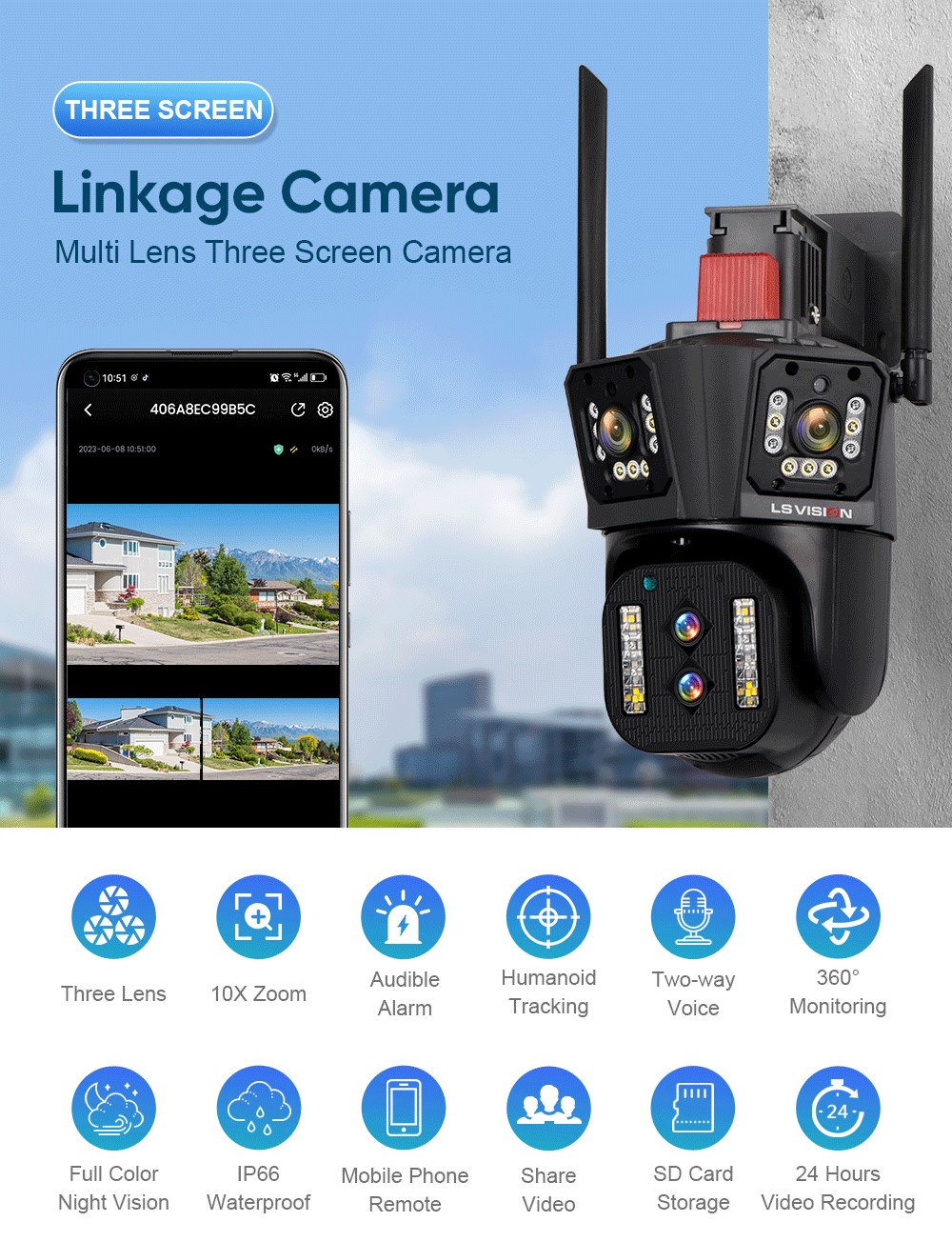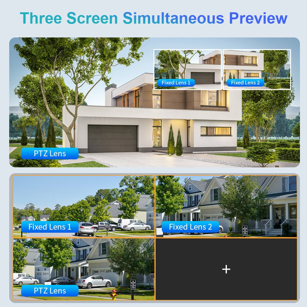 2. Frou/Три объектива с тремя экранами,Ультра-широкоугольный + 6 мм объектив PTZ для достижения четкого мониторинга издалека и вблизи;