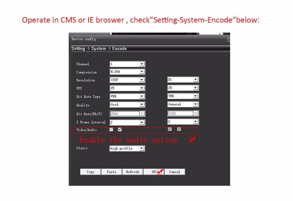 Чтобы включить функцию звука, проверьте в CMS или IE: «Настройка-Система-Кодирование», включите звук