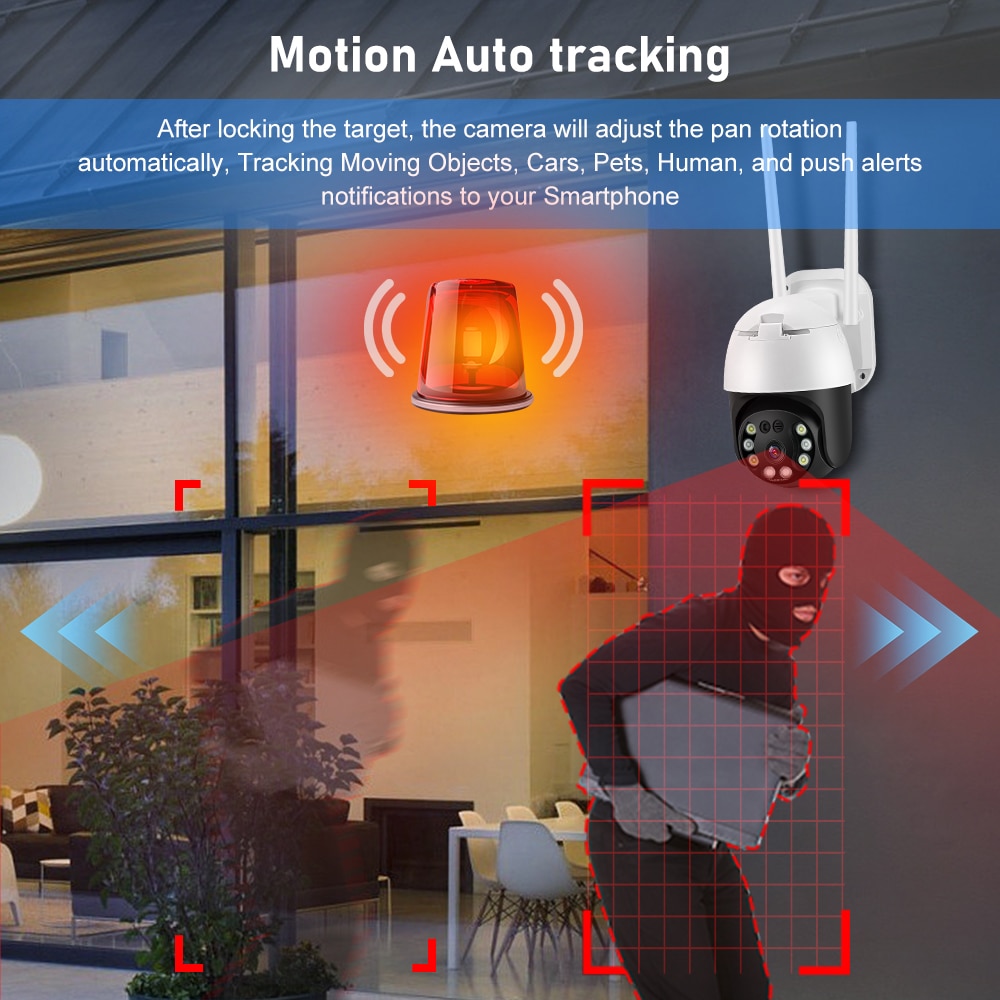 После блокировки цели камера автоматически регулирует поворот панорамирования, отслеживая движущиеся объекты, автомобили, домашних животных, человека и нажимайте уведомления о тревоге на ваш смартфон