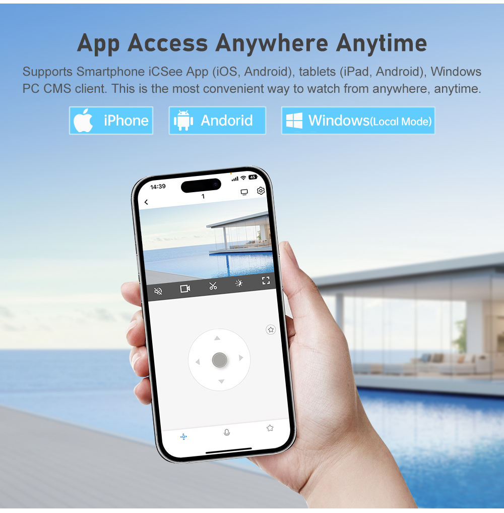 Поддерживает приложение iCSee для смартфонов (iOS, Android), планшеты (iPad, Android), клиент CMS WindowsPC. Это самый удобный способ смотреть из любого места, в любое время