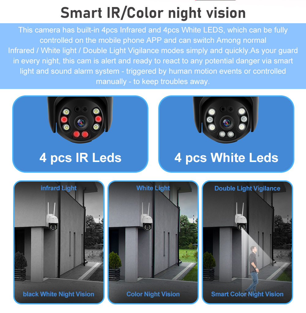 Эта камера имеет встроенные 4 шт. lnfrared и 4 шт. белых светодиодов, которые можно контролировать в приложении мобильный телефон и переключать между нормальными инфракрасными/белыми светильник/двойными светильник режимами бдительности просто и быстро. Как ваш защитник каждую ночь, Эта камера предупредительна и готова к реагированию на любую потенциальную опасность с помощью системы звуковой сигнализации smartlight, срабатывающей при движении человека или управляемой вручную, чтобы избежать проблем.
