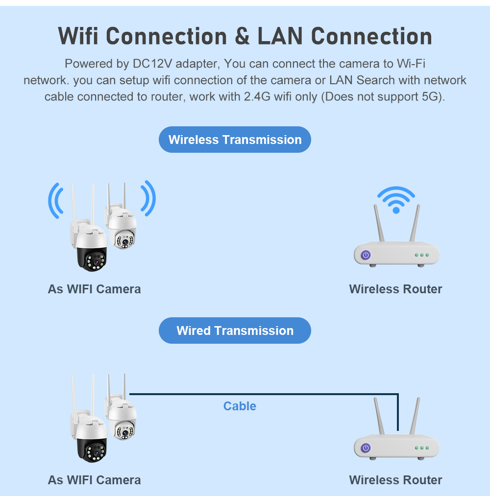 Питание от адаптера DC12V, вы можете подключить камеру к Wi-Fi-Finetwork. Вы можете настроить подключение к Wi-Fi камеры или поиск по локальной сети с помощью сетевого кабеля, подключенного к маршрутизатору, работает только с Wi-Fi 2,4G (не поддерживает 5G)