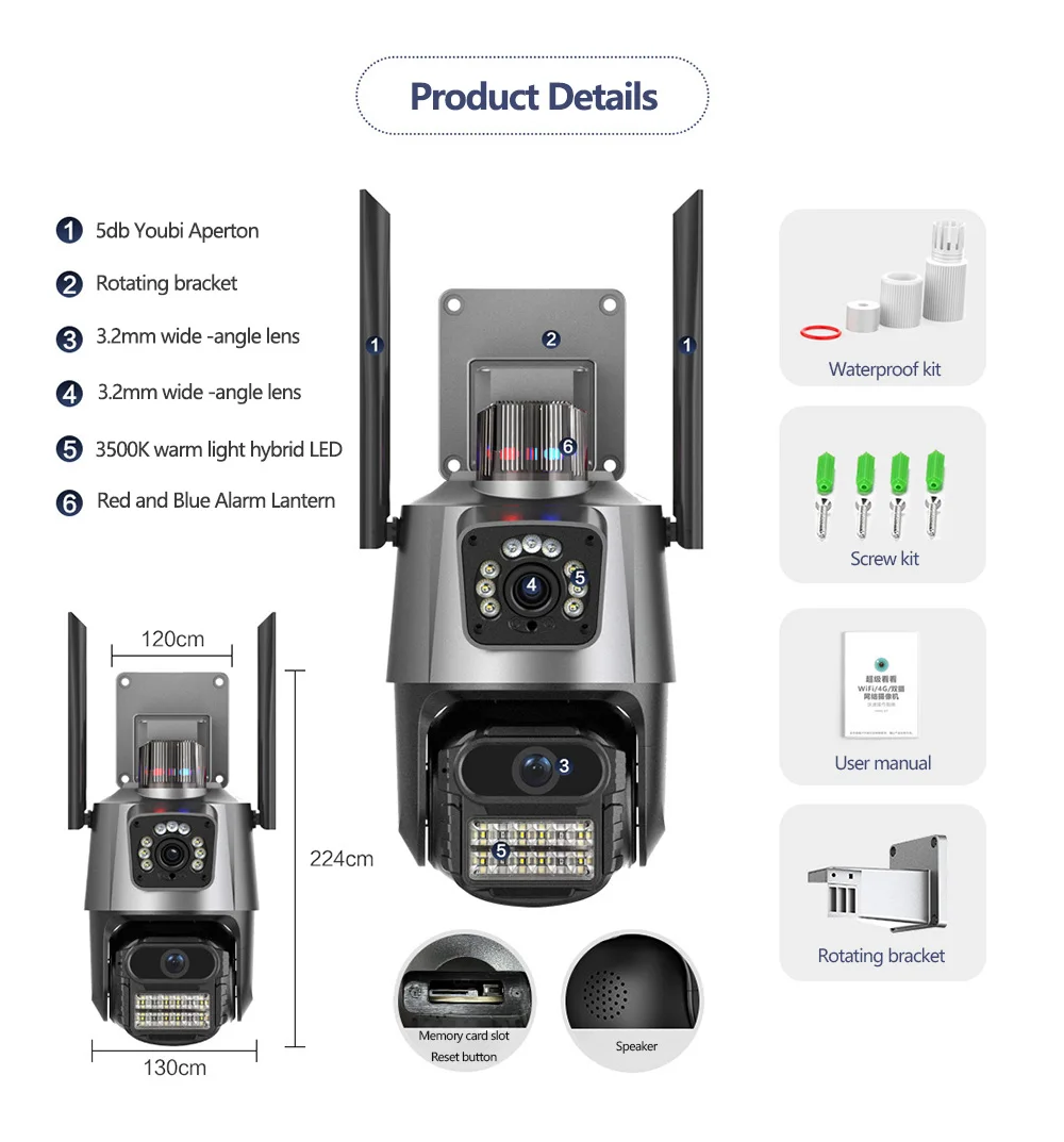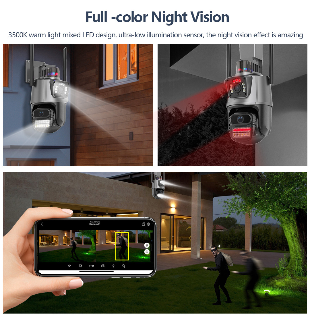 * Двойной дизайн источника света, встроенный инфракрасный свет + белый свет, инфракрасное ночное видение и полный цвет ночного видения можно установить;