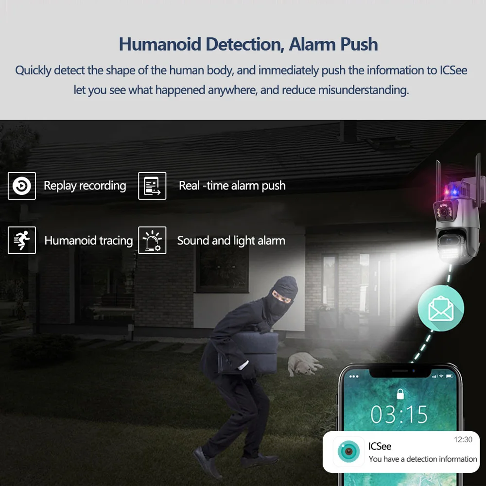 * Интеллектуальное Оповещение об обнаружении гуманоидов: движение срабатывает с помощью будильника, push-уведомлений APP и записи будильника
