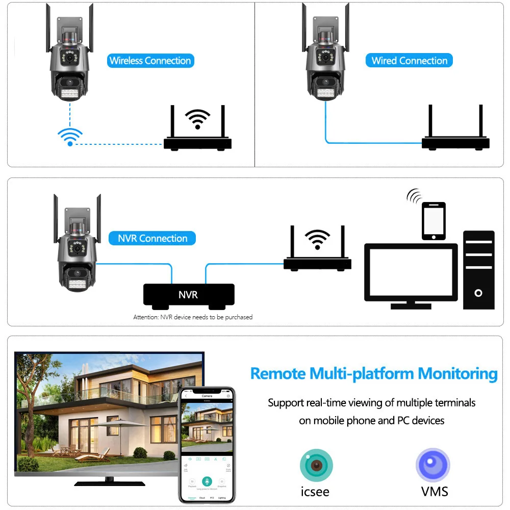 * Поддержка TF-хранилища и облачного хранилища (Требуется оплата в приложении iCSee);