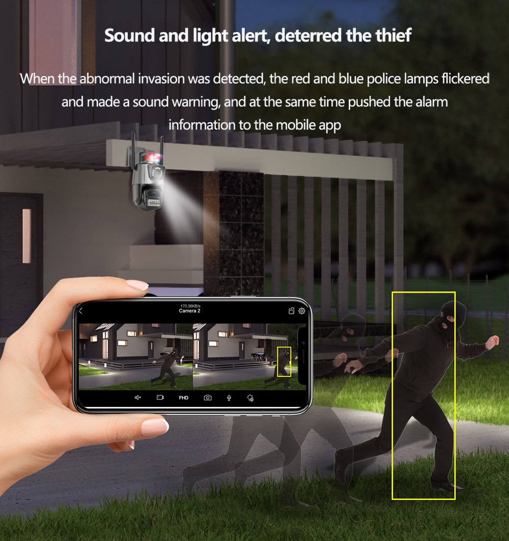Эта камера встроена в инфракрасный светодиод сверхдальнего действия и светодиодный прожектор, которыми можно полностью управлять в приложении для мобильного телефона, и может просто и быстро переключаться между нормальным/интеллектуальным/полноцветным режимами ночного видения.