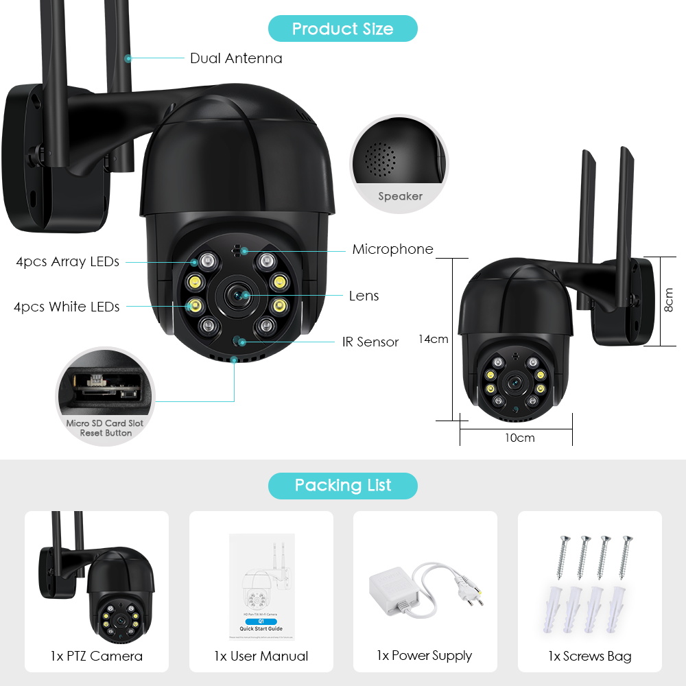 Эта камера имеет встроенный 4 шт. инфракрасный и 4 шт. белые светодиоды, который может быть полностью контролирован на мобильный телефон APP и может переключаться между нормальным инфракрасным/белым светильник/двойной светильник режима бдительности просто и быстро.
