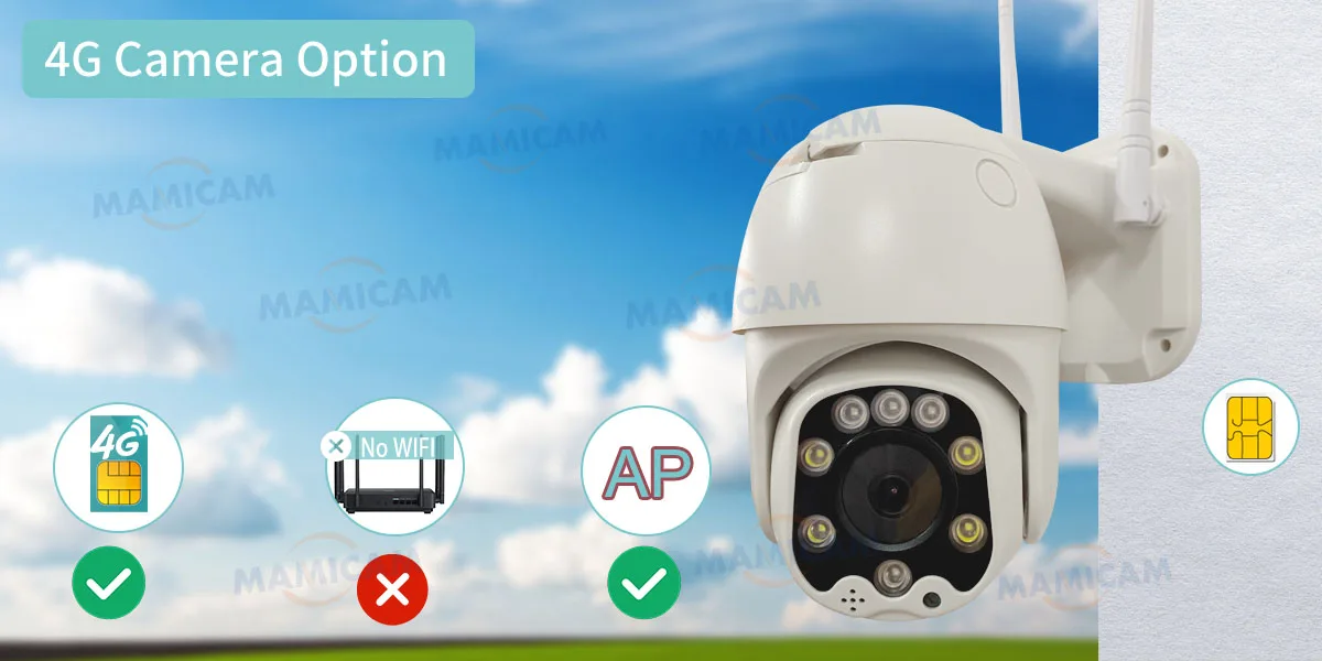 Wi-Fi камера может работать только с Wi-Fi и подключением к Интернету, она не может поддерживать Sim-карту 3G 4G.