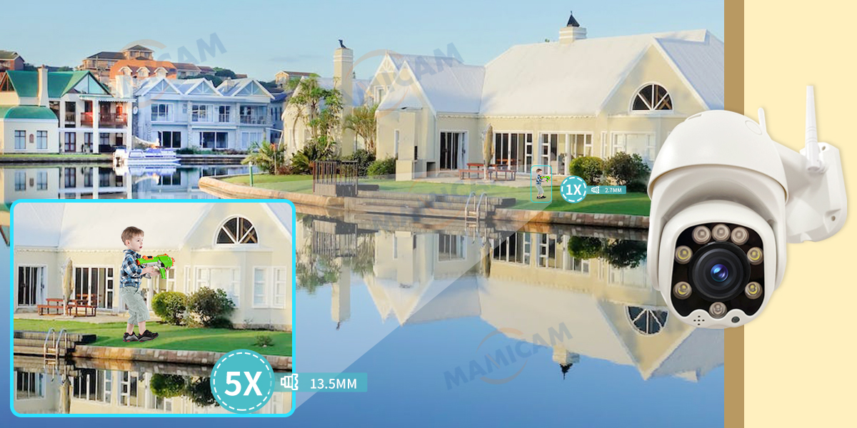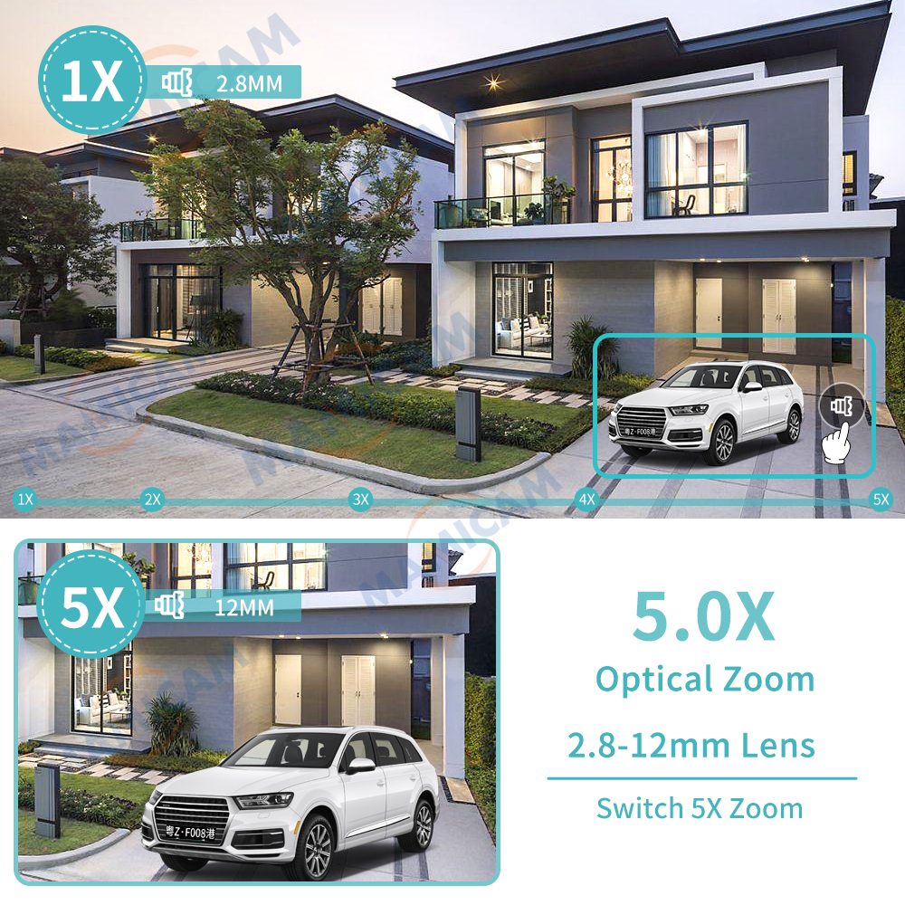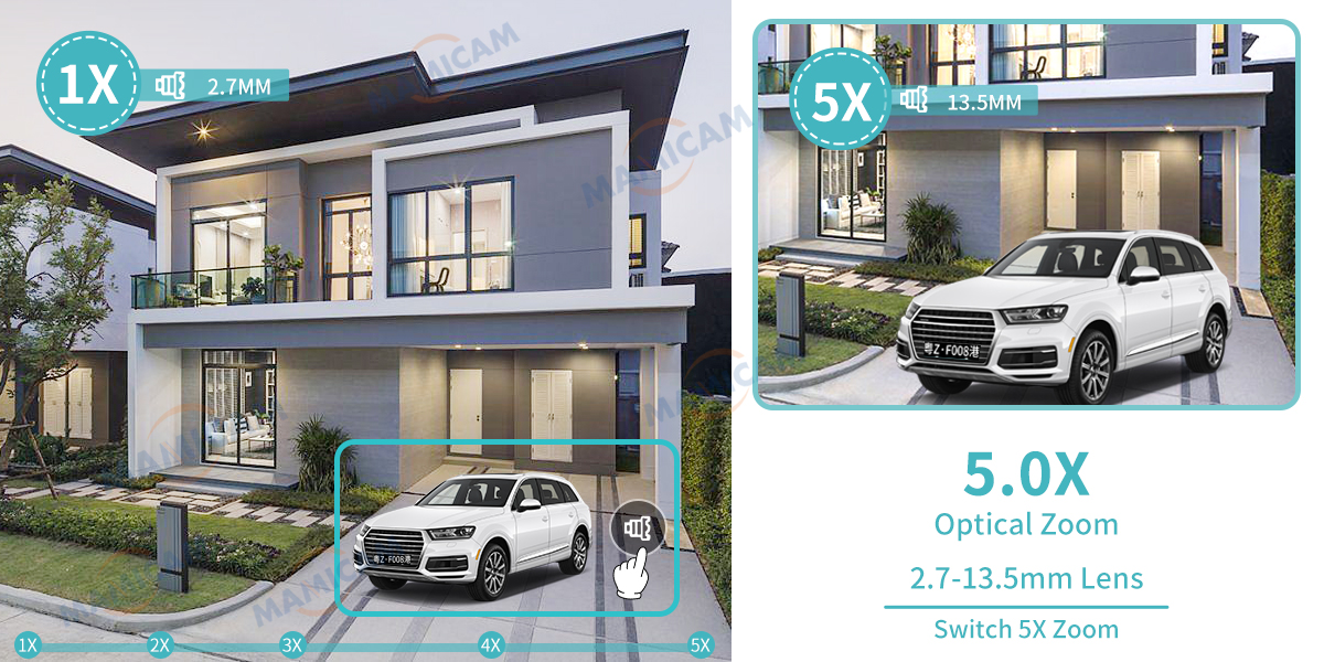Увеличение от 1X до 5X. Когда вы меняете объектив на 13,5 мм, камера увеличивается, и вы можете четко видеть номерной знак на расстоянии.