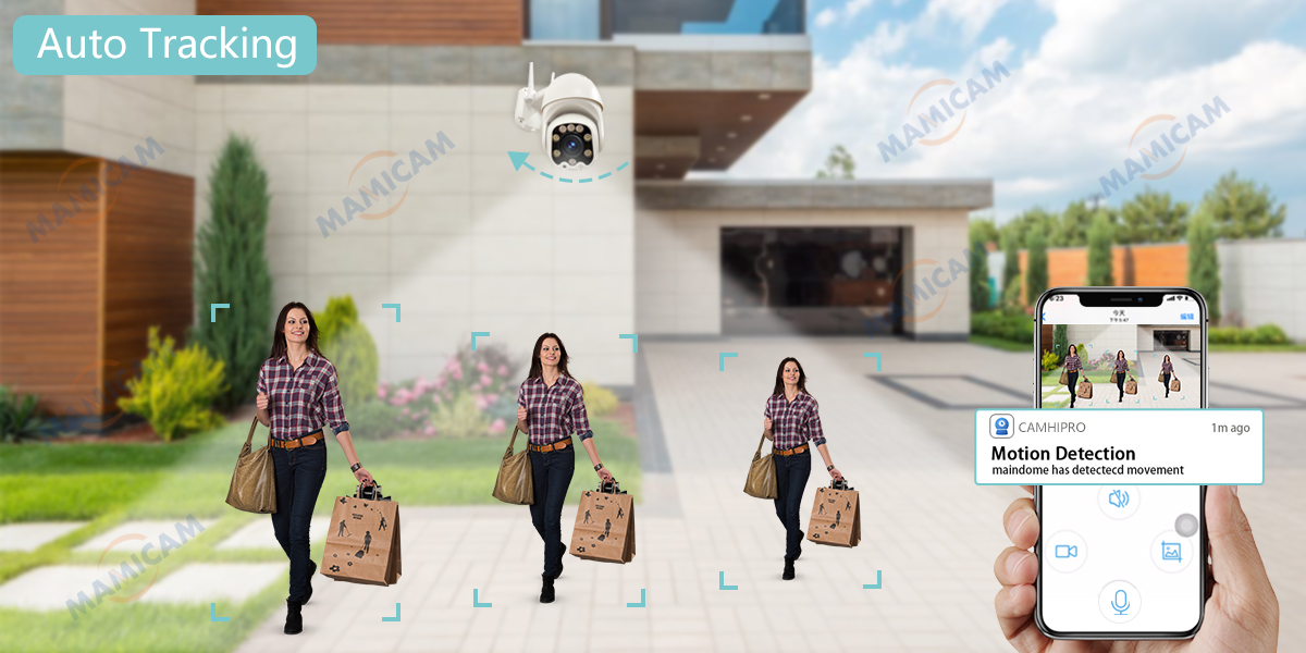 С PTZ 355 ° панорамирования 90 ° наклона, 360 ° угла обзора, беспроводная наружная камера видеонаблюдения может контролировать каждый угол. Поддержка горизонтального автоматического отслеживания и вертикального горизонтального ручного отслеживания.