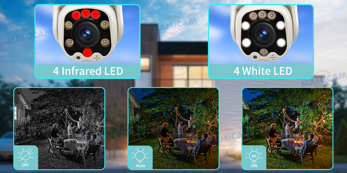 Камера имеет функцию ночного видения, смотрите каждую деталь или более четкие видео и изображения. С 4 инфракрасными очками светильник для 24 часов бдительности, Диапазон ночного видения камеры в темноте до 50 м. 4 шт. Белый светодиодный может обеспечить функцию цветного ночного видения на расстоянии до 20 метров.