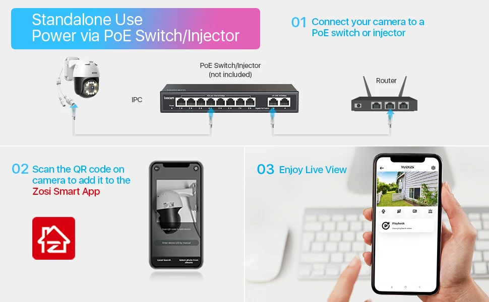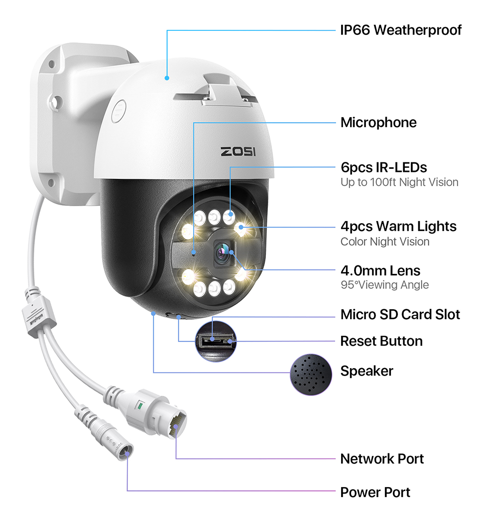 Наша камера PoE оснащена слотом для карты Micro SD для хранения до 128 ГБ или вы можете подключить его к сетевому видеорегистраторУ ZOSI PoE для увеличения времени записи, обеспечивая широкие возможности хранения для ваших нужд наблюдения.