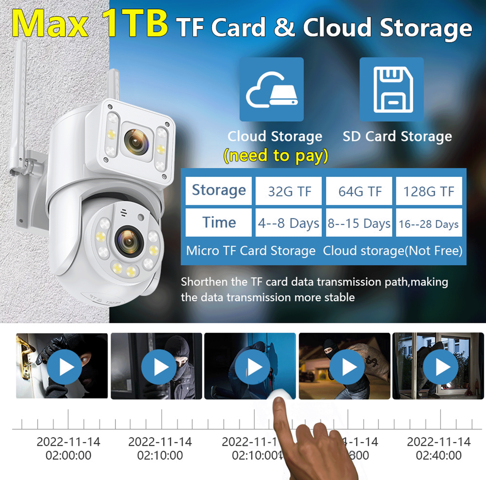 Эта камера наблюдения поддерживает два варианта хранения: хранилище для карт TF и Облачное хранилище (доступно за плату).