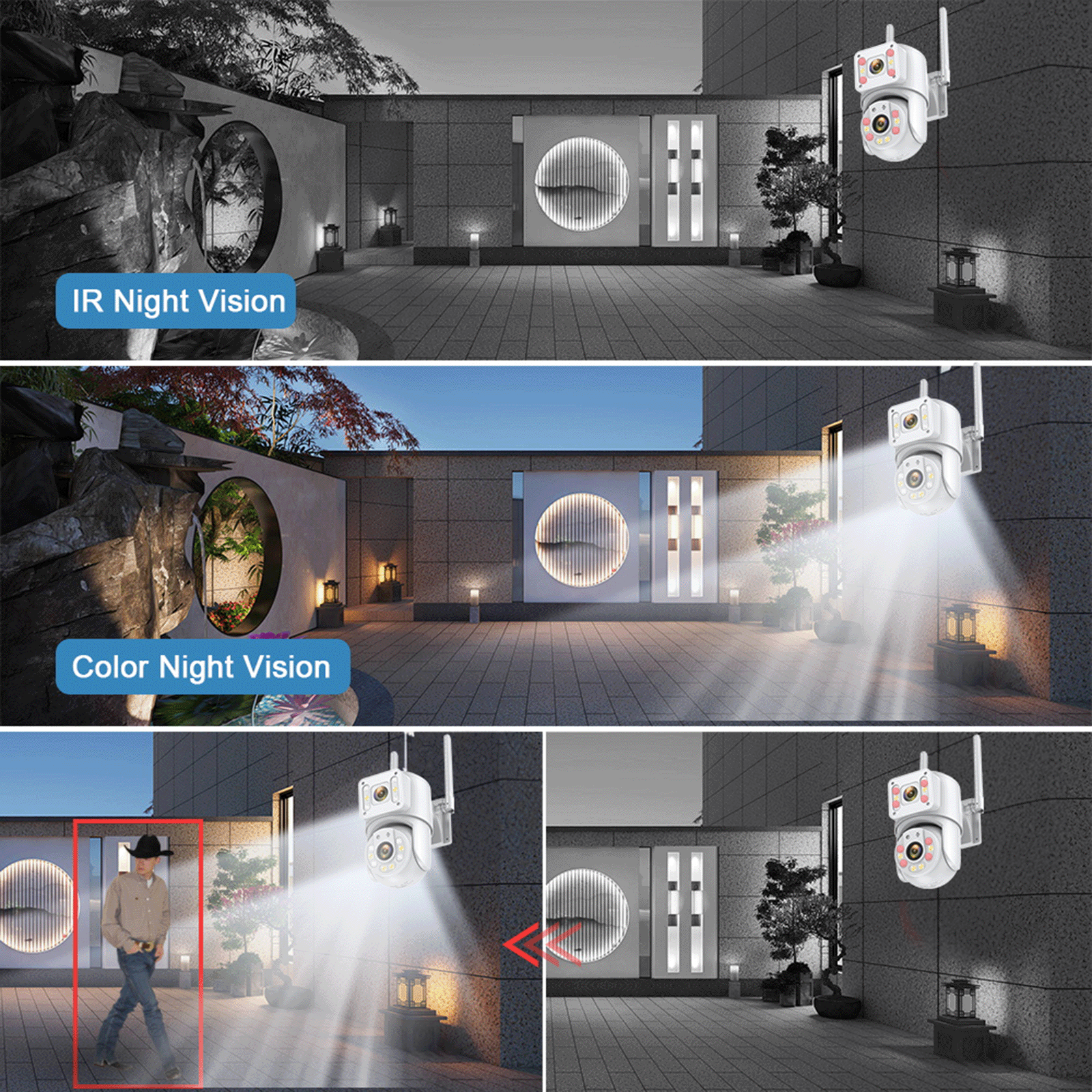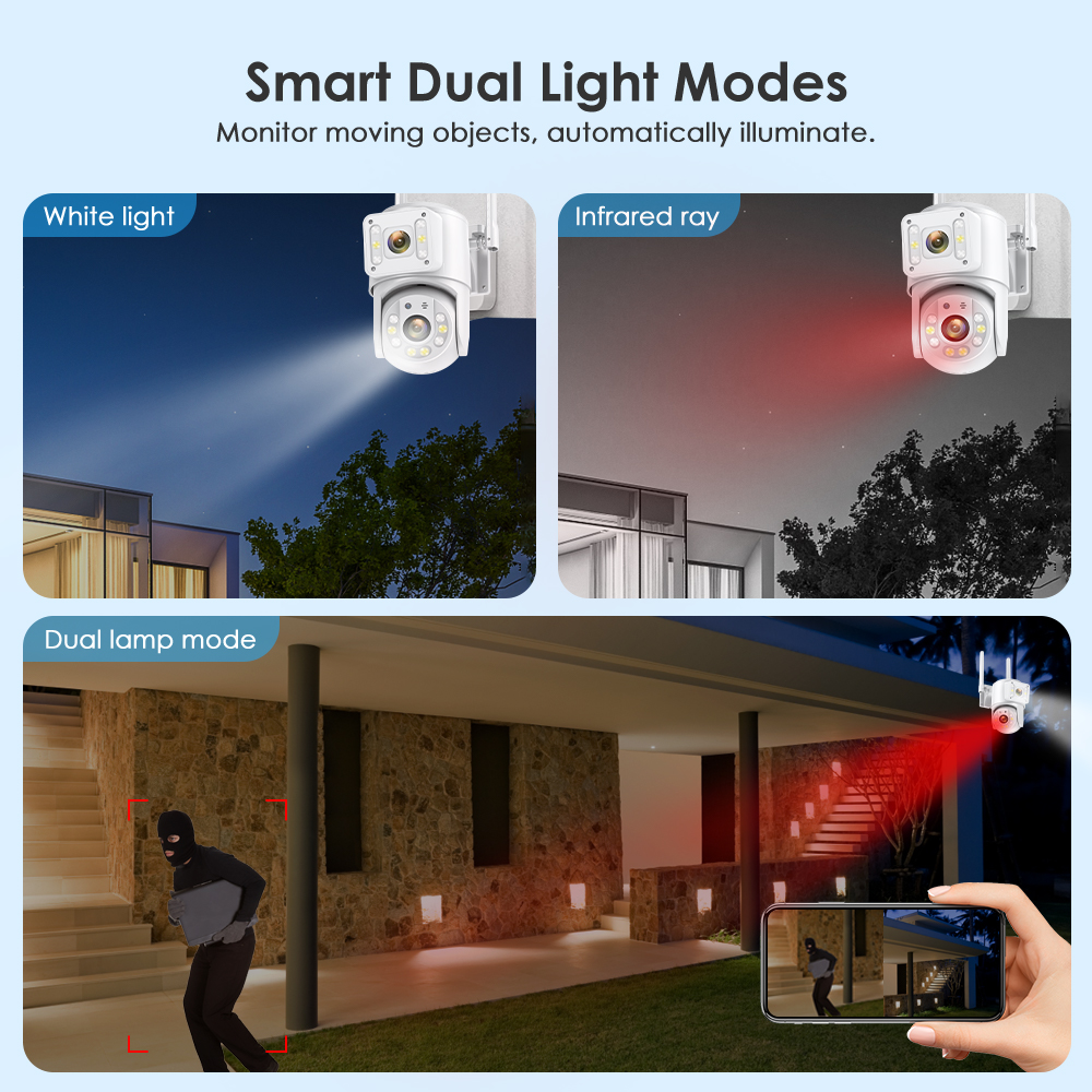 Благодаря сочетанию интеллектуального режима двойного освещения, обнаружения движения и автоматического освещения эта камера наблюдения обеспечивает эффективное и интеллектуальное решение для мониторинга, которое может быть применено к различным сценариям мониторинга безопасности, обеспечение вашей безопасности и спокойствия.