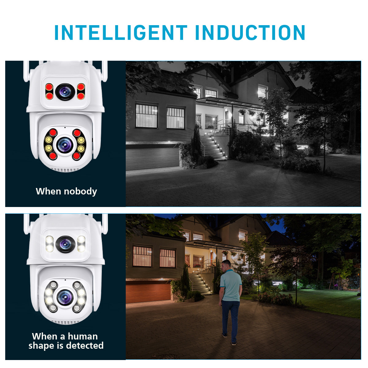 Двойной объектив, Двойной экран, Уведомления о тревоге, гуманоид слежения, двухсторонний голосовой домофон 360 мониторинга, полноцветный ночного видения, IP66 водонепроницаемый, мобильный телефон удаленного мониторинга, обмениваться видео, SD-карты памяти, 24-часовая запись видео