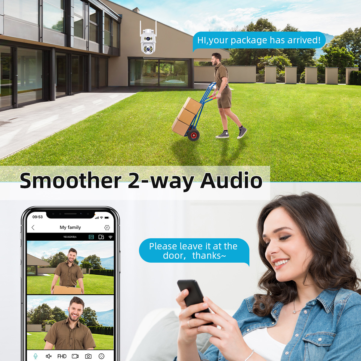 Благодаря горизонтальному 270 ° и вертикальному 90 ° вы можете удаленно управлять наружной камерой Wi-Fi, чтобы просматривать каждый угол с помощью мобильного телефона. Автоматическое отслеживание AI