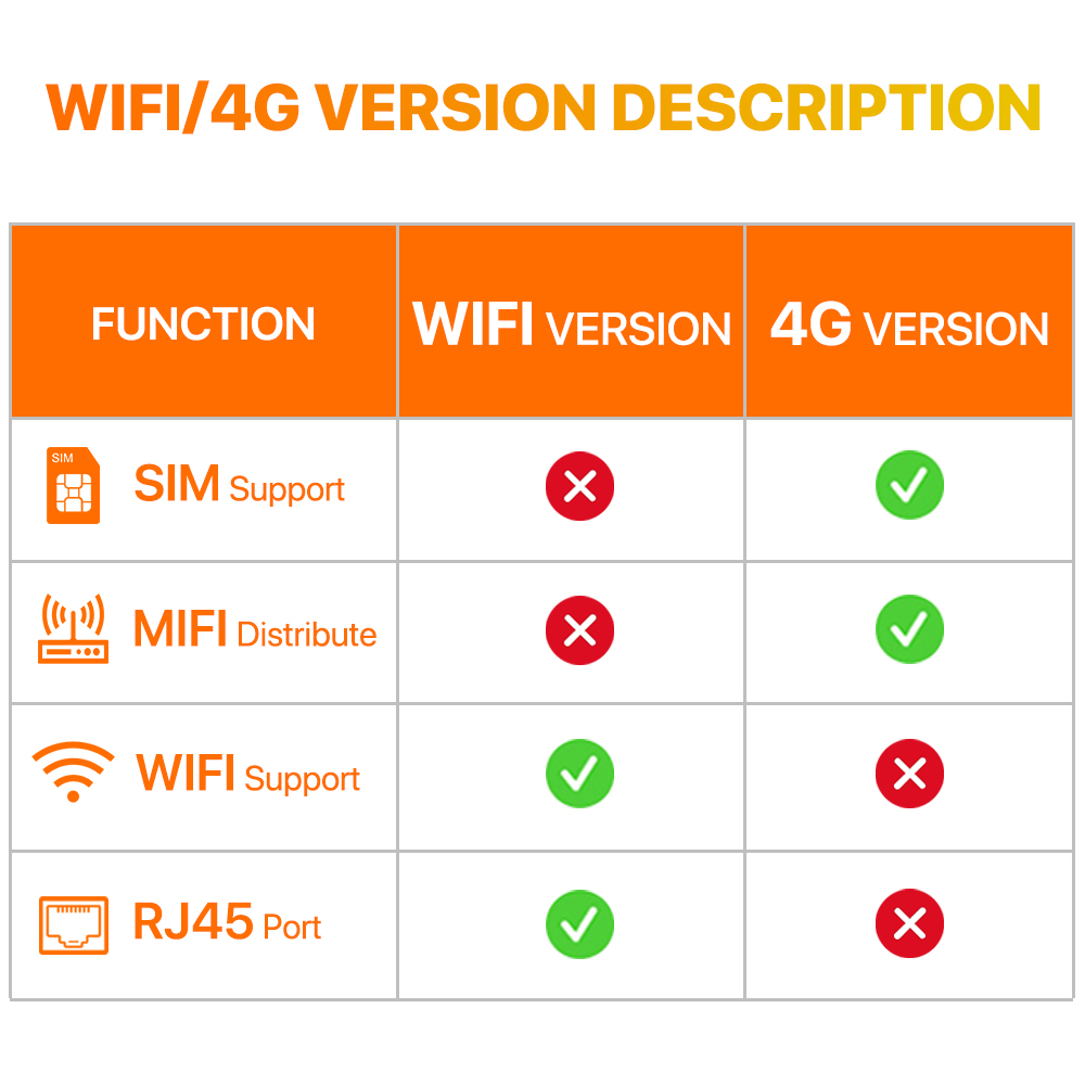-Версия 4G работает только с сетью SIM-карты, версия Wi-Fi работает только с сетью 2,4G Wi-Fi