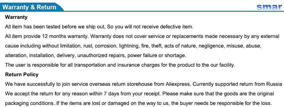 1. Качество: Мы гарантируем, что товары на складе в России/Испании/Польше и товары на складе в Китае являются товарами одинакового качества;