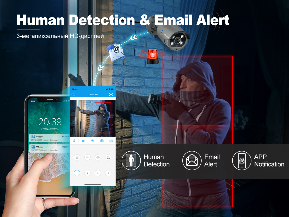 Когда кто-то пробирается в зону съемки, в приложение вашего телефона будут отправлены тревожные сообщения с камеры.