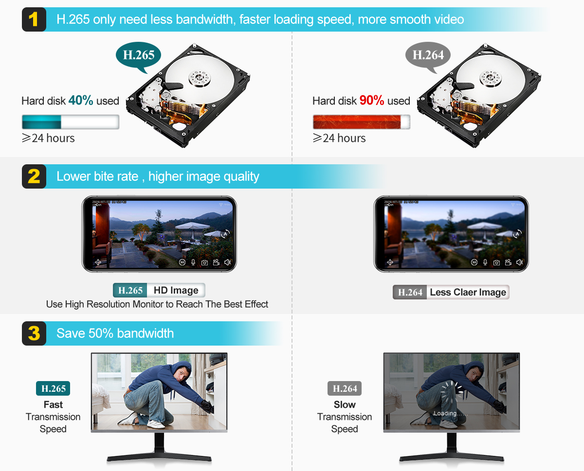 H.265 нужна только более низкая пропускная способность, скорость загрузки быстрее, более плавное воспроизведение видео.