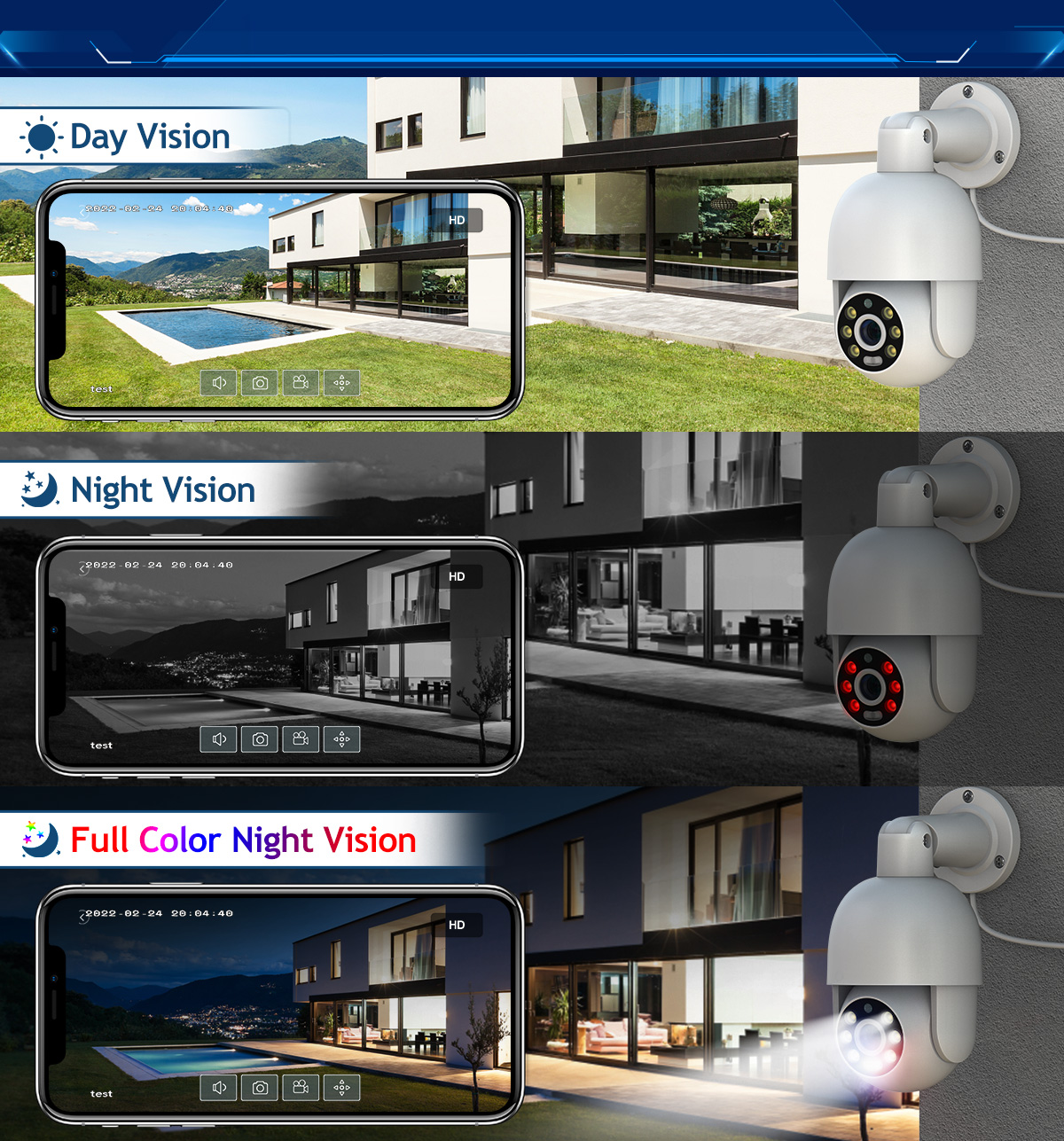 Когда белый светодиодный светильник горит, камера будет отображать красочное видение ночью, и вы можете выбрать три ночных режима (черный светильник полноцветный, инфракрасное ночное видение, двойное предупреждение).