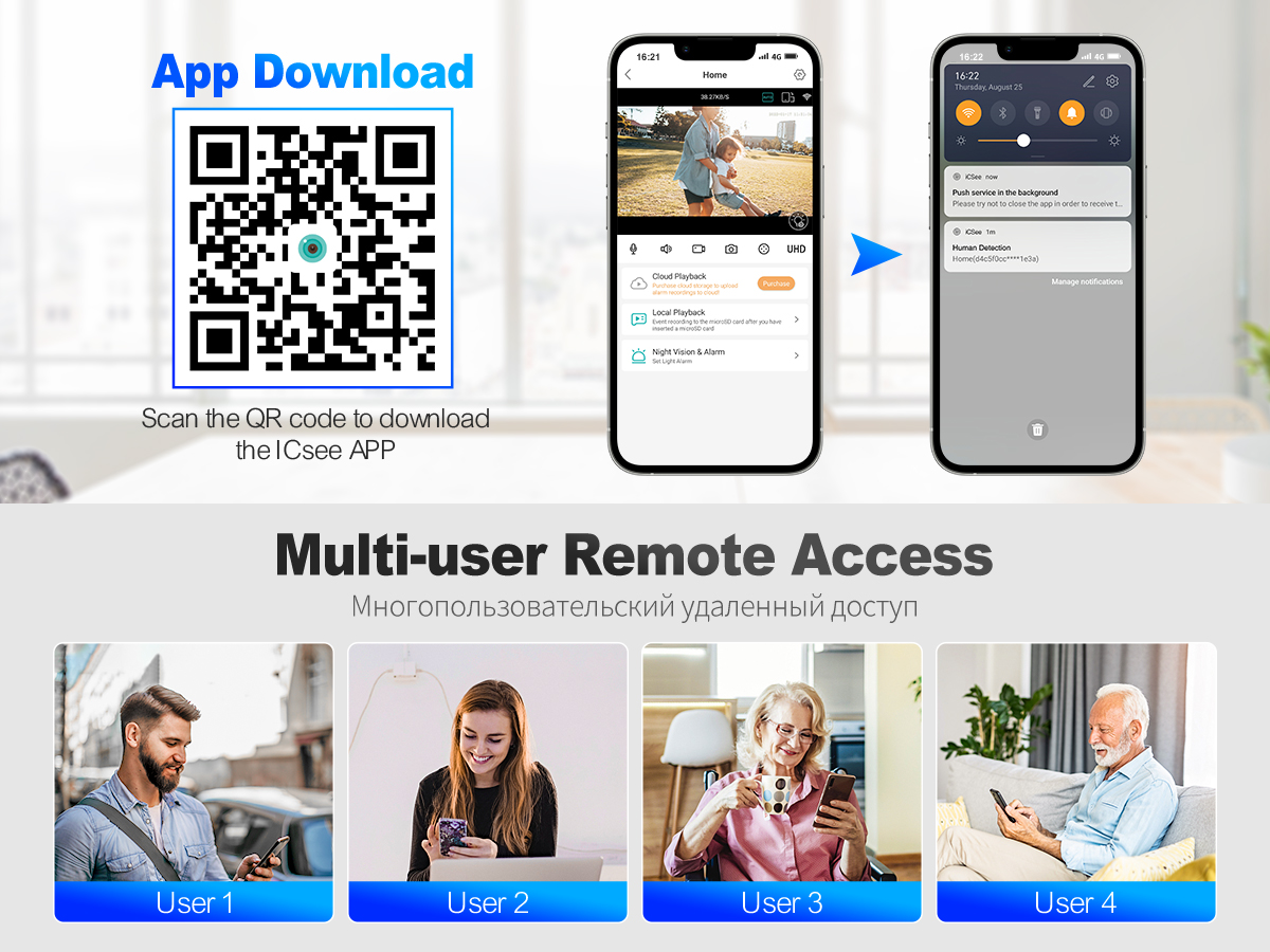 * Удаленный доступ P2P/многопользовательский: технология P2P позволяет вам просматривать живую ситуацию в вашем доме, где бы вы ни находились, просто с помощью p2p-аккаунта в приложении через смартфон или планшет;