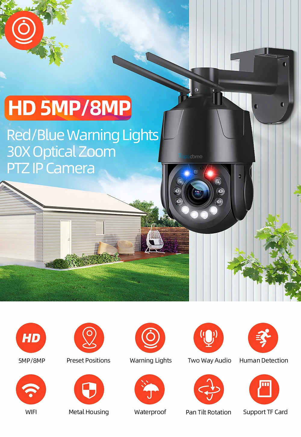 Topodome 5MP/8MP WiFi/4G TF карта Голосовая Интерком гуманоидный отслеживающий красный/синий светильник оповещение 30X оптический зум все металлические PTZ IP камеры