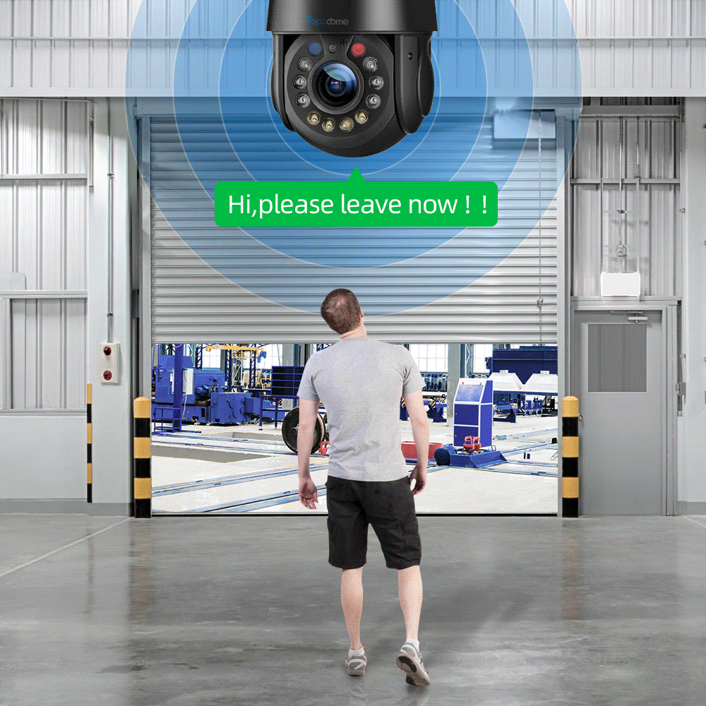 Когда камера обнаруживает сигнал тревоги, камера предупредит красный и синий светильник и воспроизводит ваш индивидуальный голос.