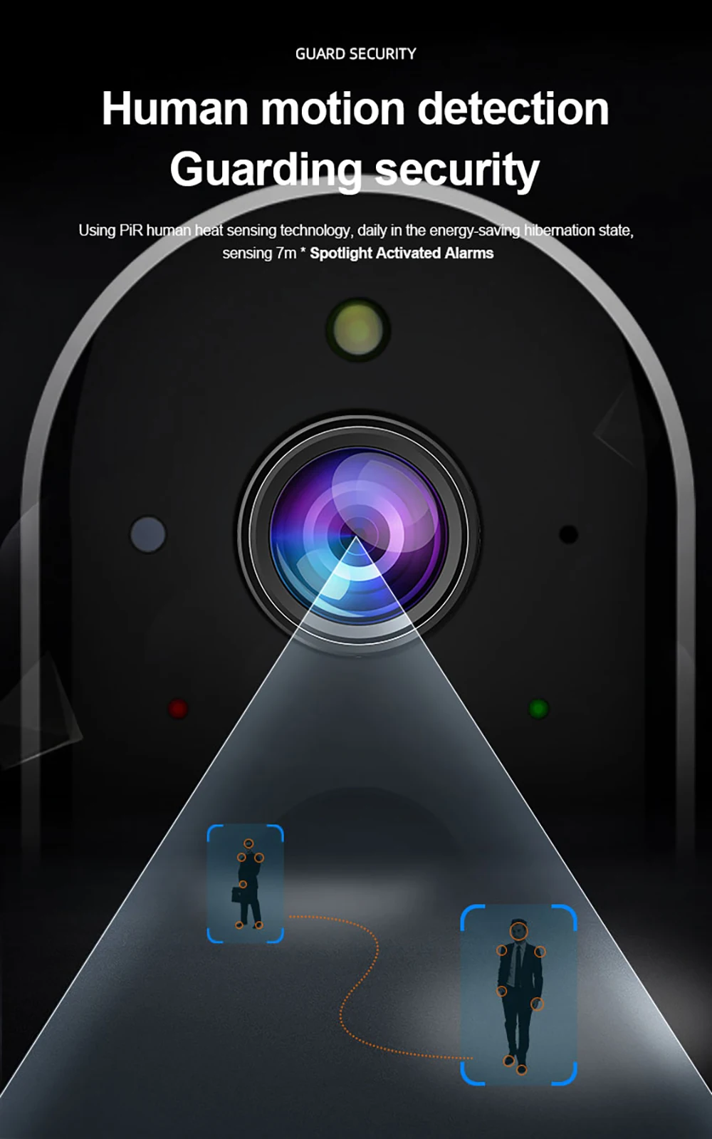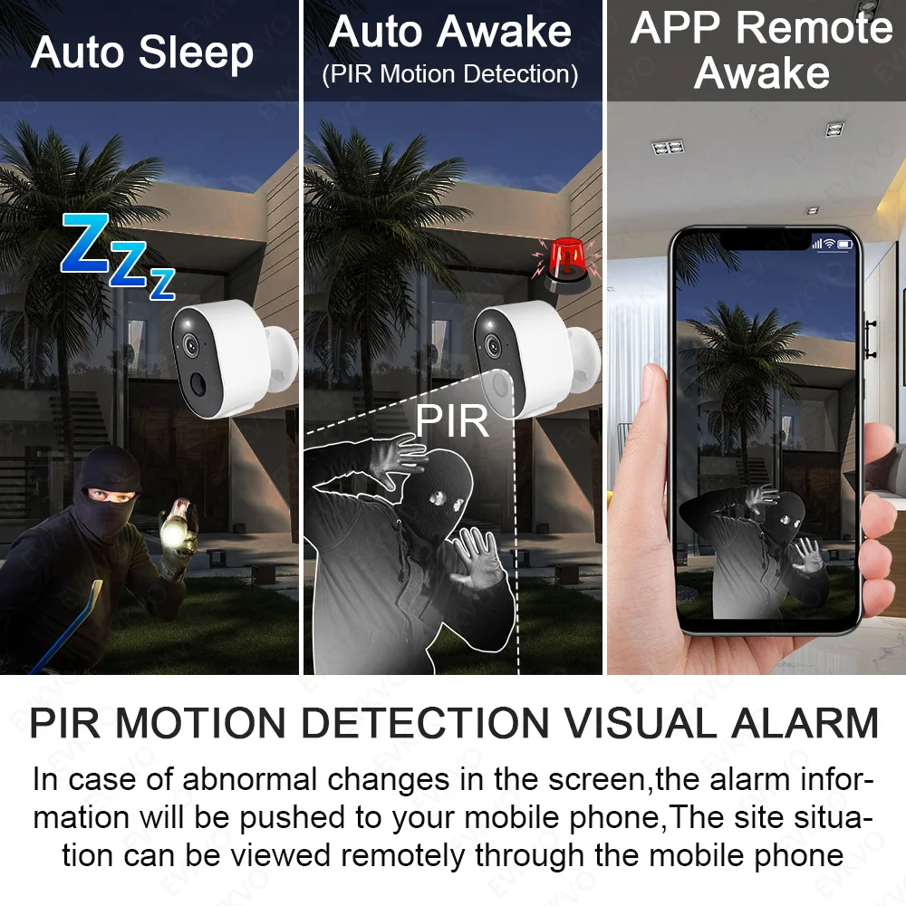 Когда камера обнаружит движение гуманоида, прожектор будет включен, и ваш телефон получит предупреждающее сообщение, или вы включите звуковой сигнал будильника, чтобы защитить вашу семью и отвергнуть плохих парней.