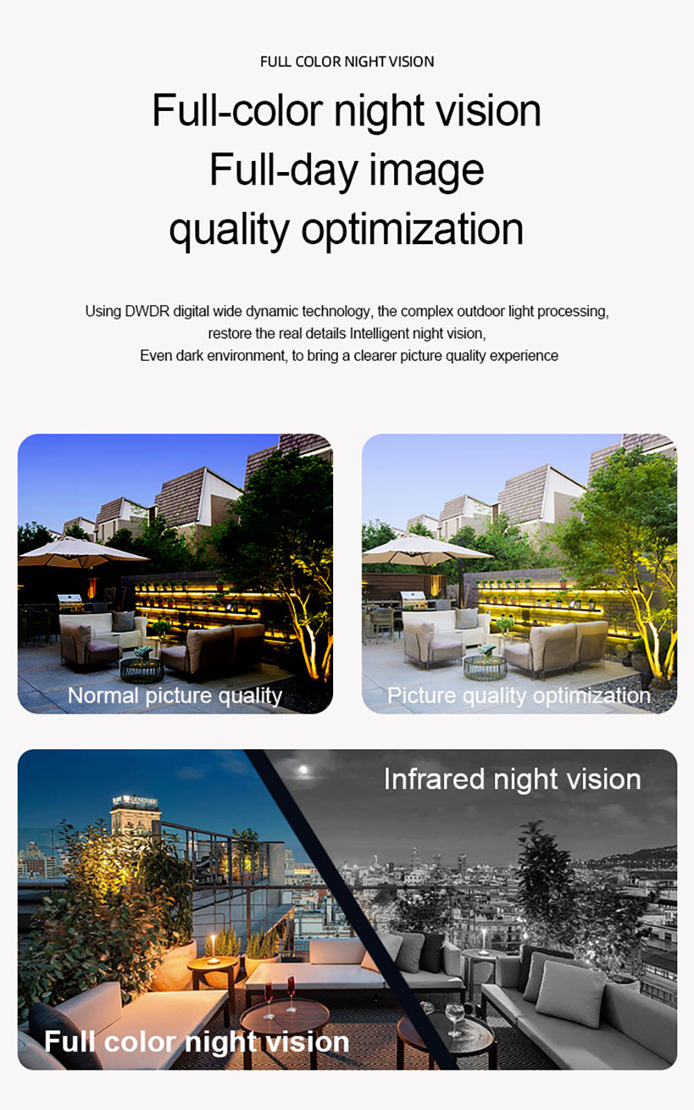 Есть два режима ночного видения, полноцветный и инфракрасный режим ночного видения, даже в темную ночь вы можете видеть так же ясно, как и днем, и изображение оптимизировано,