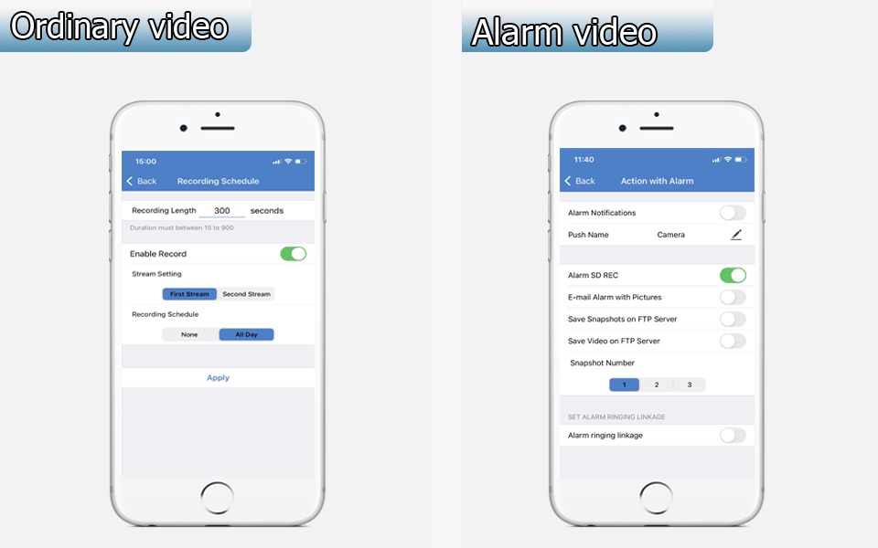 SD-карта может выбрать непрерывную запись или запись только при обнаружении движения. Когда SD-карта заполнится, она автоматически закроет старое видео. Чтобы рассмотреть возможность загрузки видео с тревогой на FTP или отправки его на почтовый ящик. Продолжительность видео тревоги ограничена 15 секундами. Обычные видео можно настроить до 900 секунд.