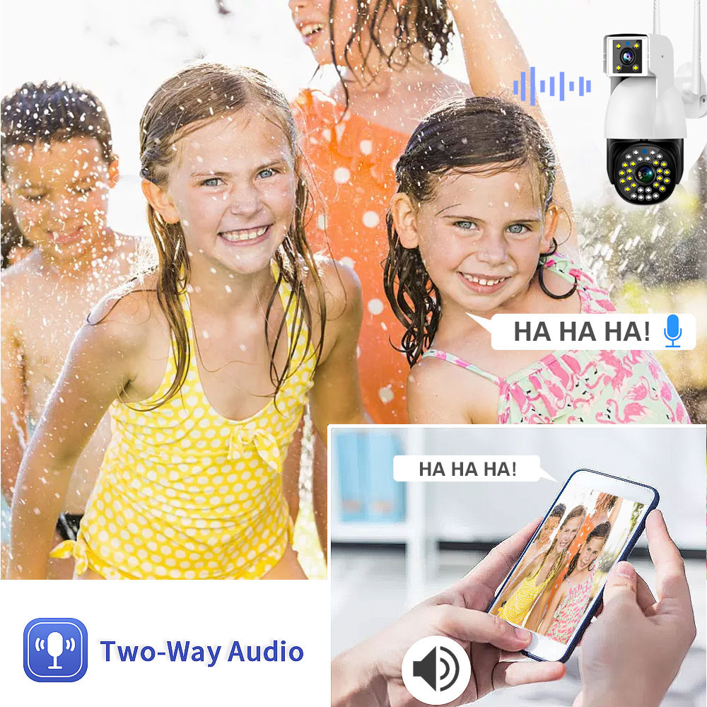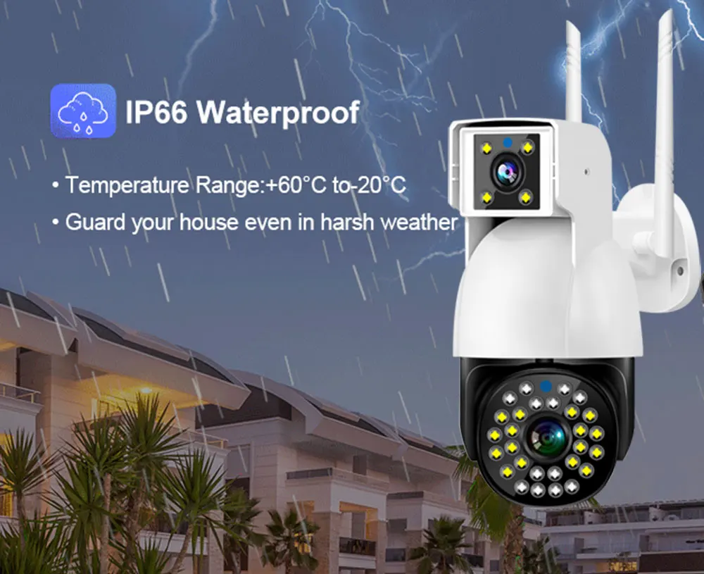 Двойной объектив, двойной экран, Полицейская световая сигнализация, отслеживание гуманоидов, двухсторонний голосовой домофон 360 мониторинг, полноцветное ночное видение, водонепроницаемость IP66, удаленный мониторинг мобильного телефона, обмен видео, хранение SD-карты, 24 часа записи видео...