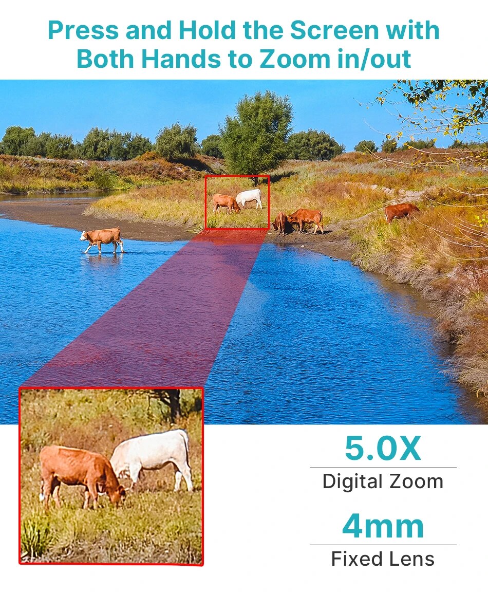 Эта камера поддерживает 5,0-кратный цифровой зум. Нажмите и удерживайте экран обеими руками, чтобы увеличить/выключить и увидеть более подробную информацию.