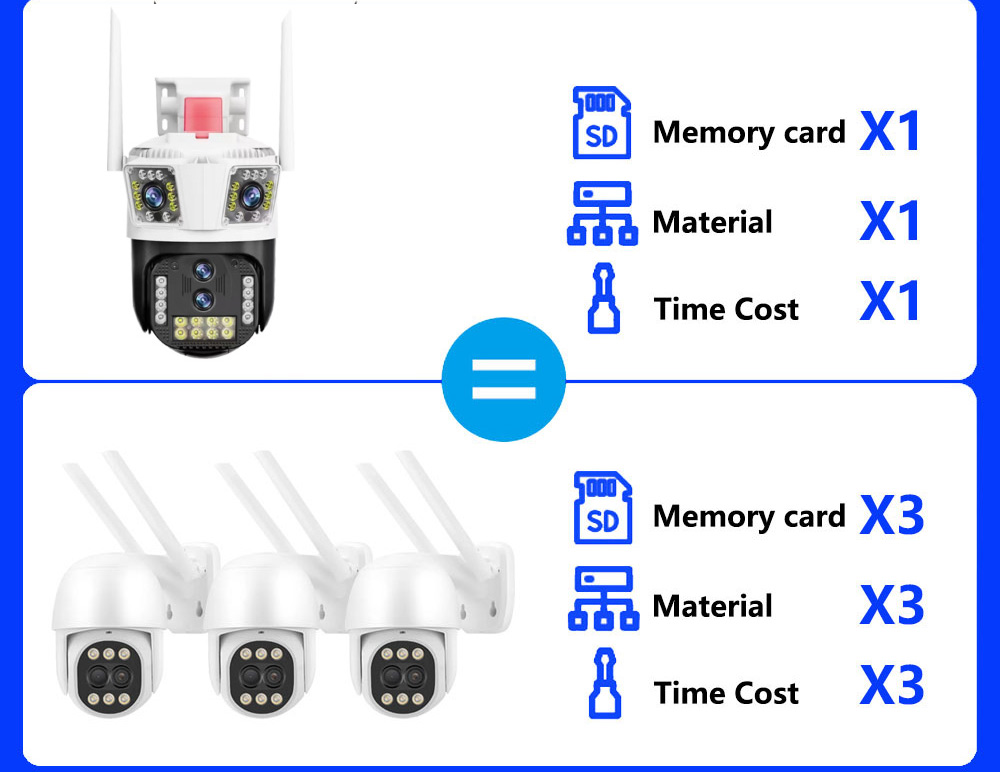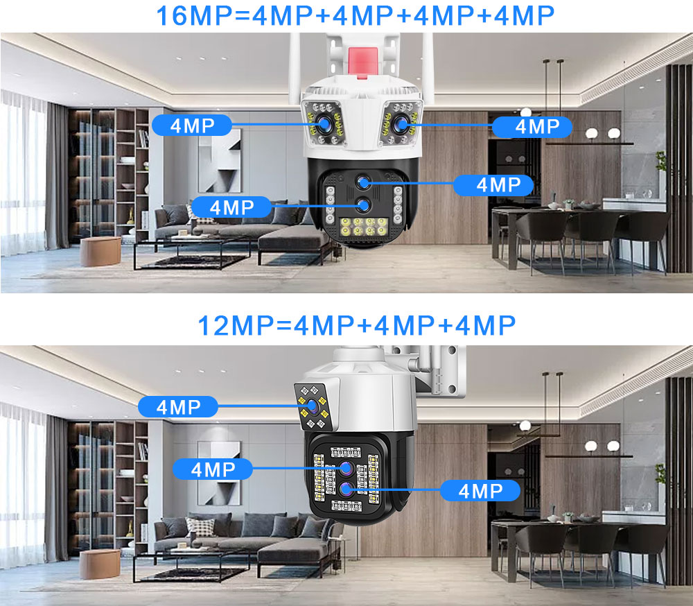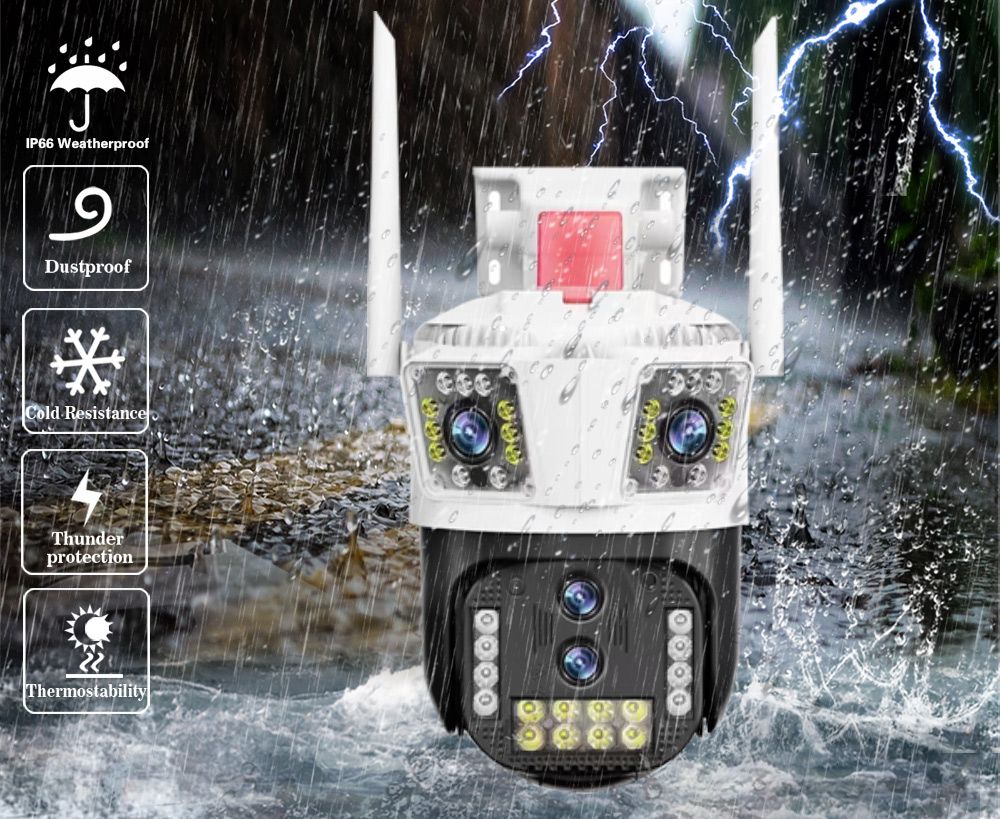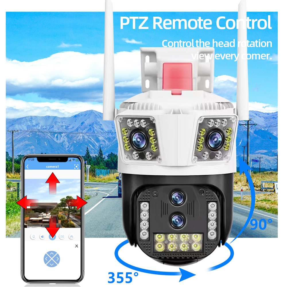 Камера оснащена четырьмя объективами, а верхними двумя фиксированными объективами. Нижний объектив имеет функцию панорамирования и наклона, которая может управлять вращением и многоугольным видоискателем для достижения двухэкранного дисплея и многоугольного видоискателя.