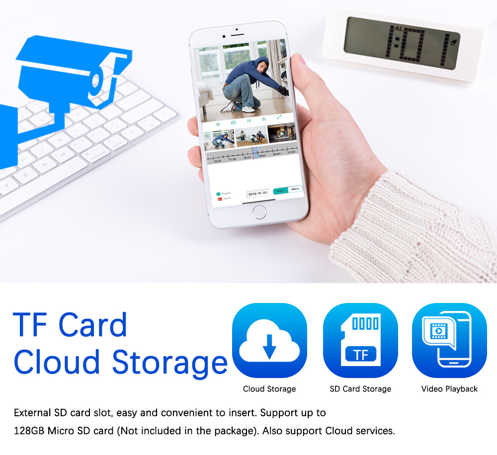 Камера поддерживает Локальное резервное копирование на TF-карту объемом до 128 ГБ, а также предоставляет услугу облачного хранилища (необходимо доплатить)