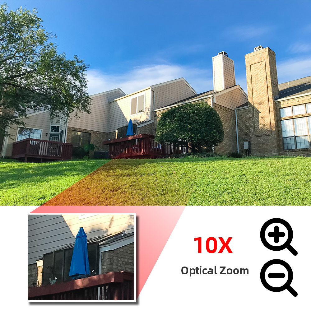 2. Двойной экран с четырьмя объективами и двумя датчиками, сверхширокоугольный + 10-кратный зум для достижения четкого мониторинга издалека и вблизи;
