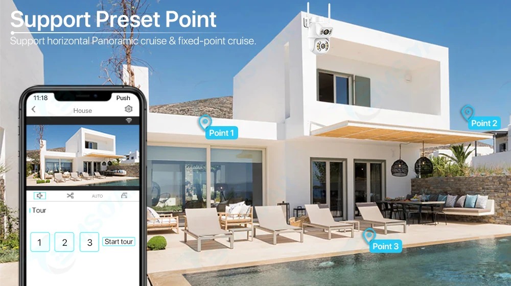 Можно установить поддержку для представления точек мониторинга и до 3-х круизных подарков. Вы можете последовательно запускать предопределенные и автоматические круиз-команды для достижения цели мониторинга фиксированной точки.