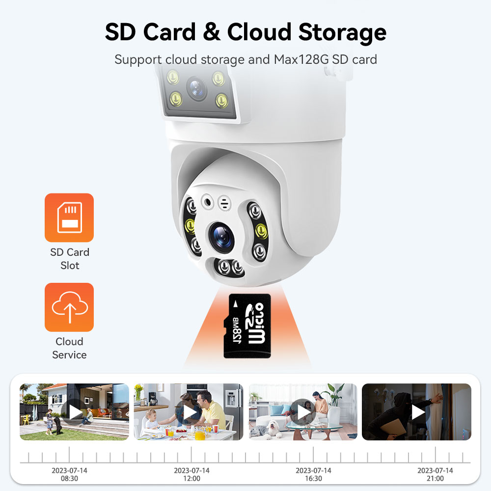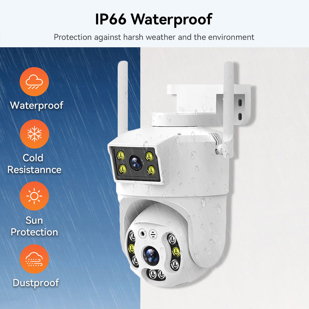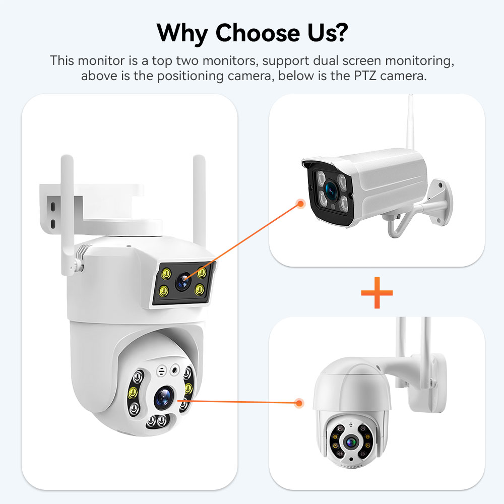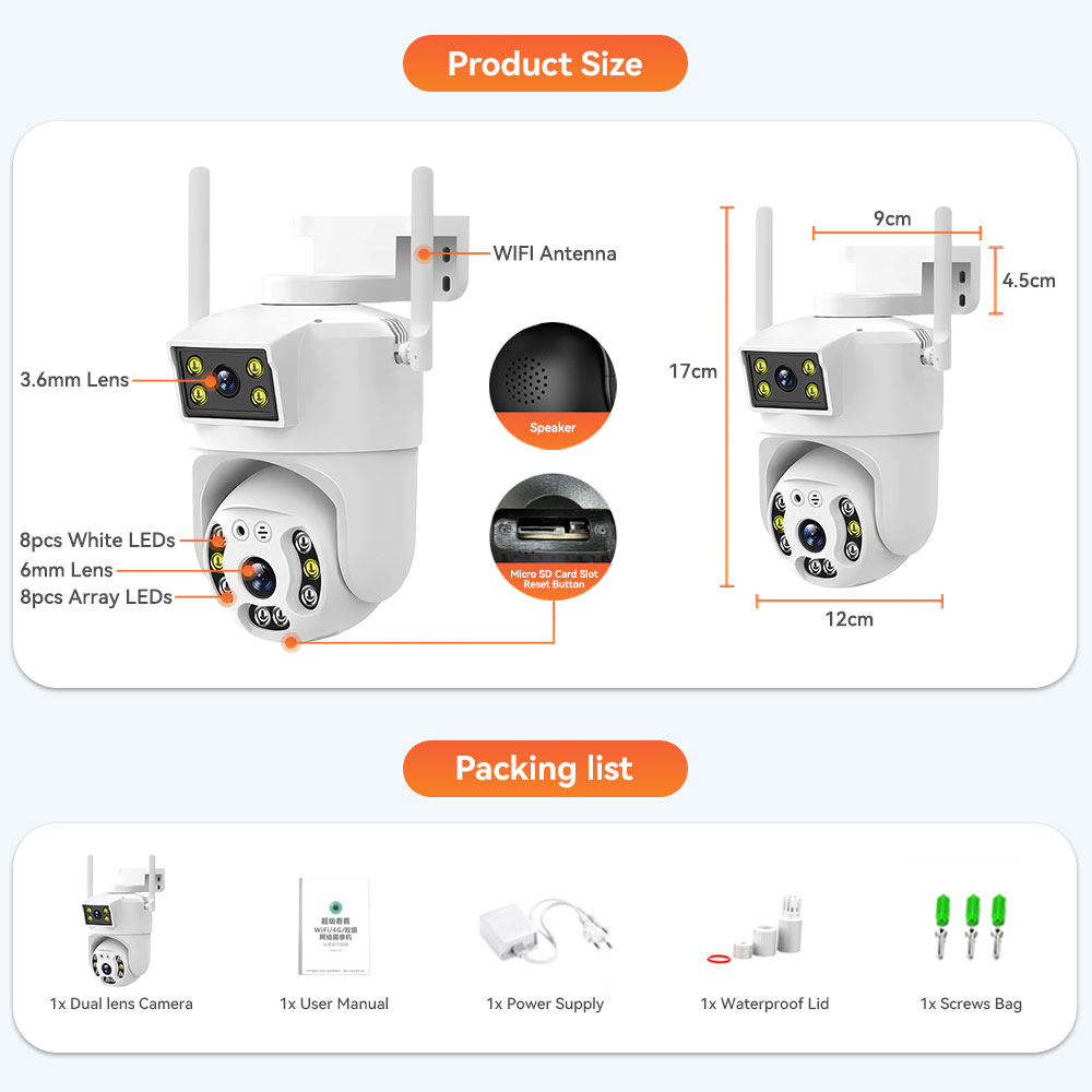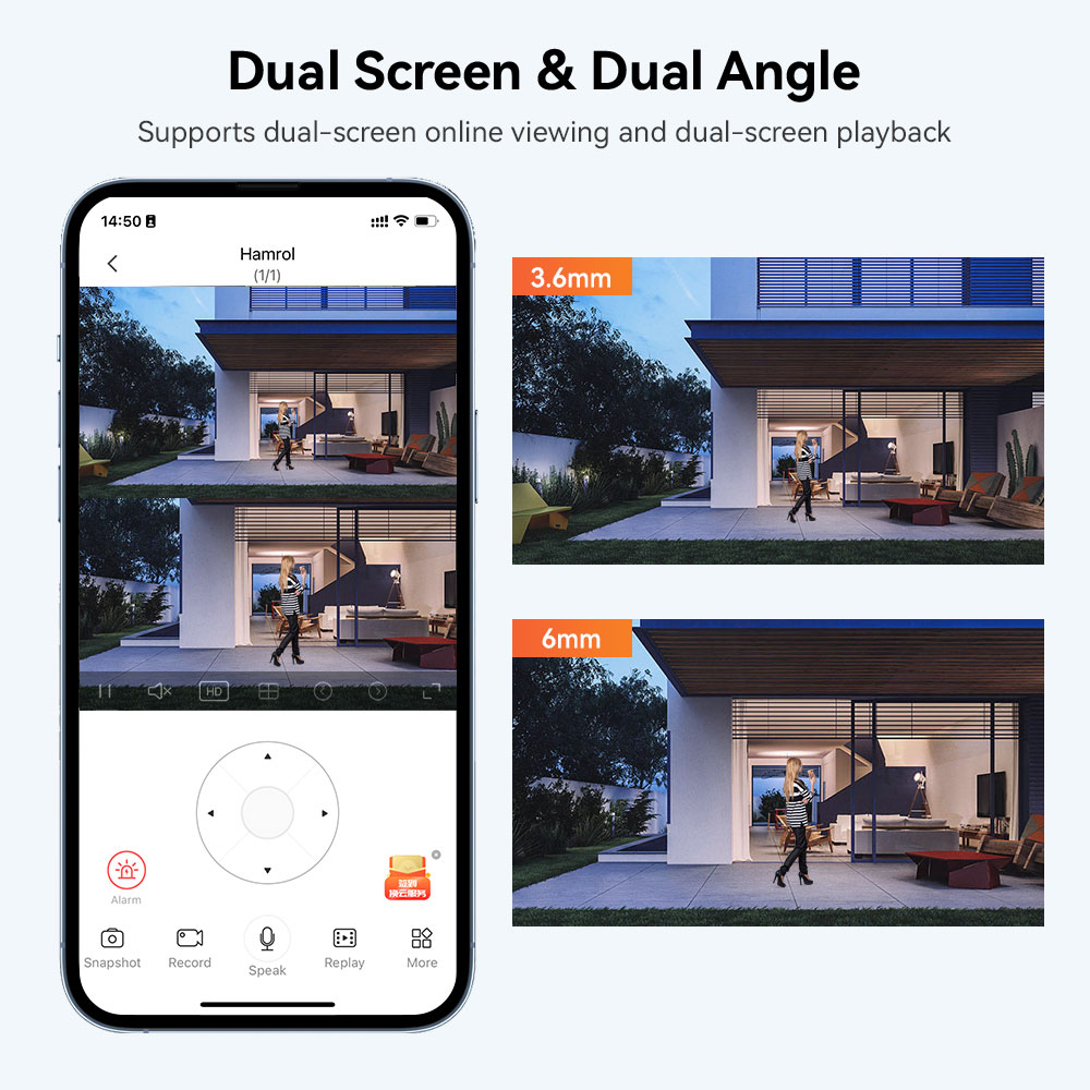 Двойной объектив, двойной экран, 5-кратный зум, Полицейская сигнализация, отслеживание гуманоидов, Двусторонняя голосовая связь светильник мониторинг, полноцветное ночное видение, водонепроницаемость IP66, 360 удаленный мониторинг, обмен видео, хранение SD-карты, 24-часовая запись видео