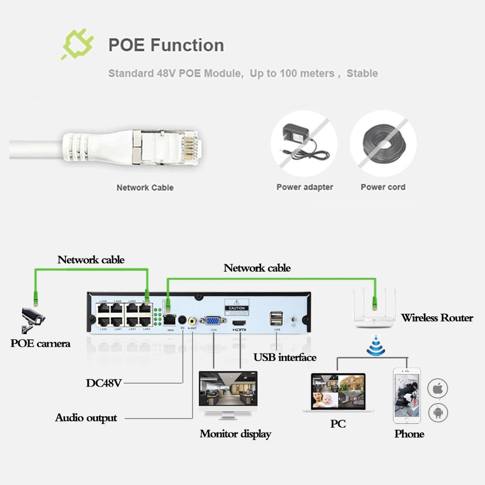 2: Подключите камеру к подключи и работай POE NVR 48V (адаптер питания не требуется)