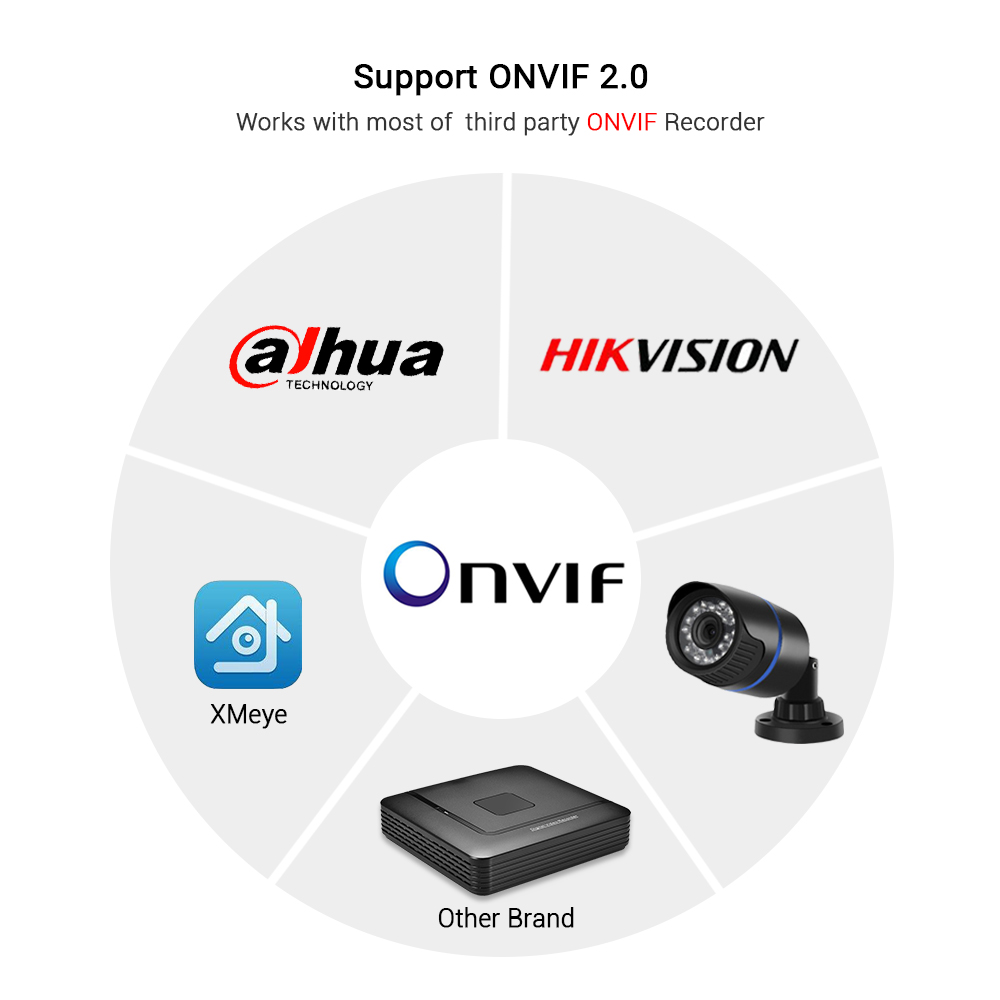 Эта IP-камера с протоколом ONVIF может работать с NVR ONVIF, чтобы иметь наилучшую совместимость, рекомендуется использовать вместе с нашим NVR.