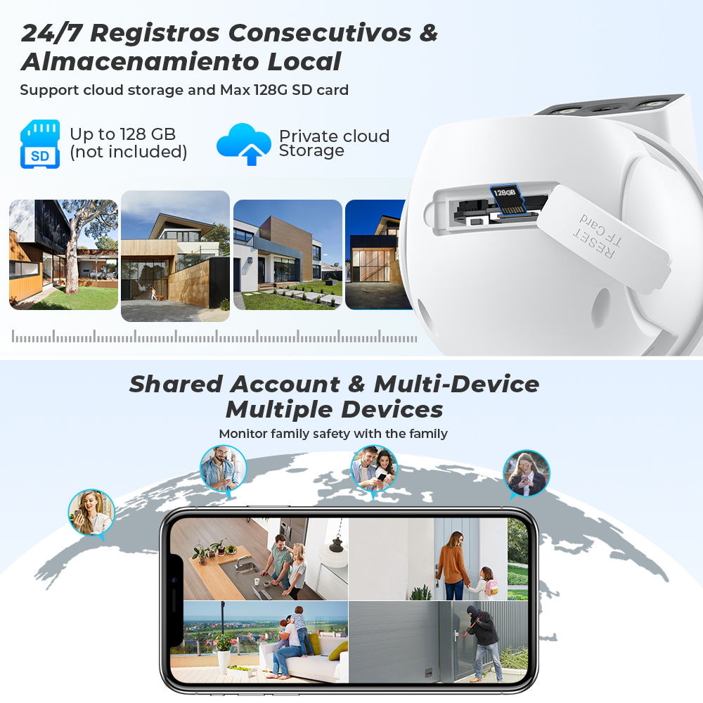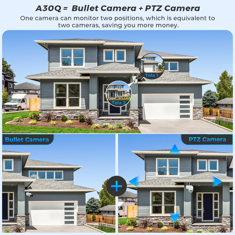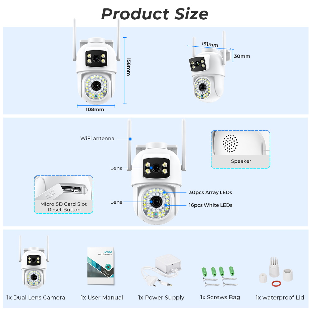 Двойной объектив, Двойной экран, Сигнализация уведомлений, отслеживание гуманоидов, двухсторонний голосовой домофон 360 мониторинг, полноцветное ночное видение, водонепроницаемость IP66, удаленный мониторинг мобильного телефона, обмен видео, хранение SD-карты, 24 часа записи видео.