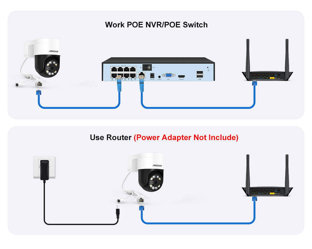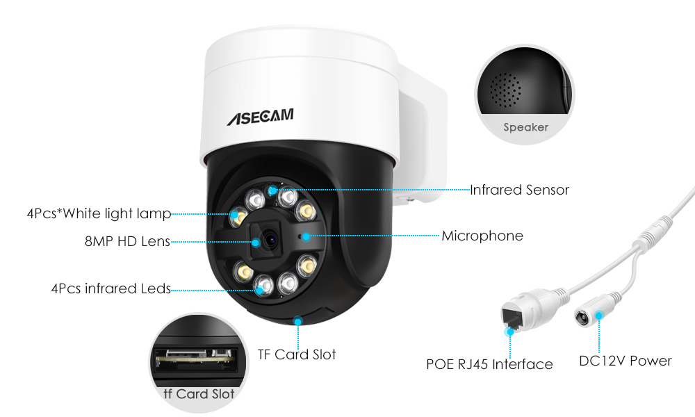 Поворот панорамирования/наклона PTZ на 355 градусов по вертикали на 90 градусов, Управляйте углом поворота через приложение. Это позволяет вам видеть больше прицела, без слепых зон.