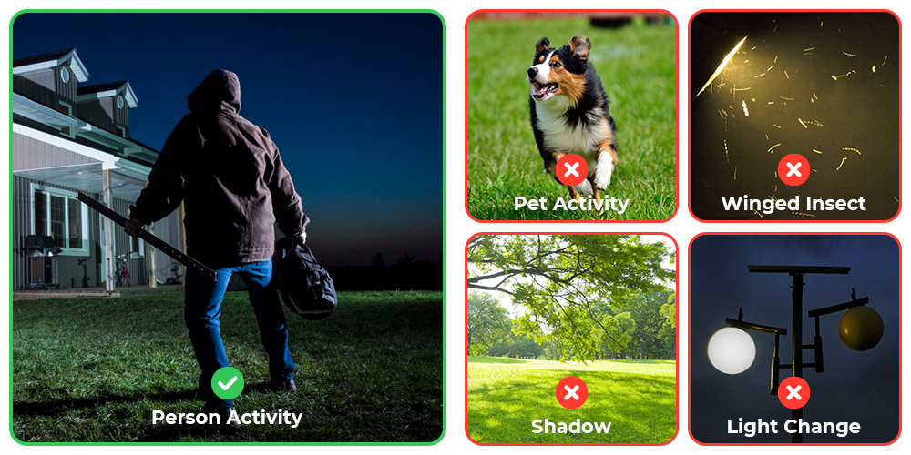 AI Human Detection отличается от традиционного PIR или обнаружения движения. Встроенный обновленный датчик будет обнаруживать только движение человека, не будет срабатывать при помощи листьев, животных или насекомых.