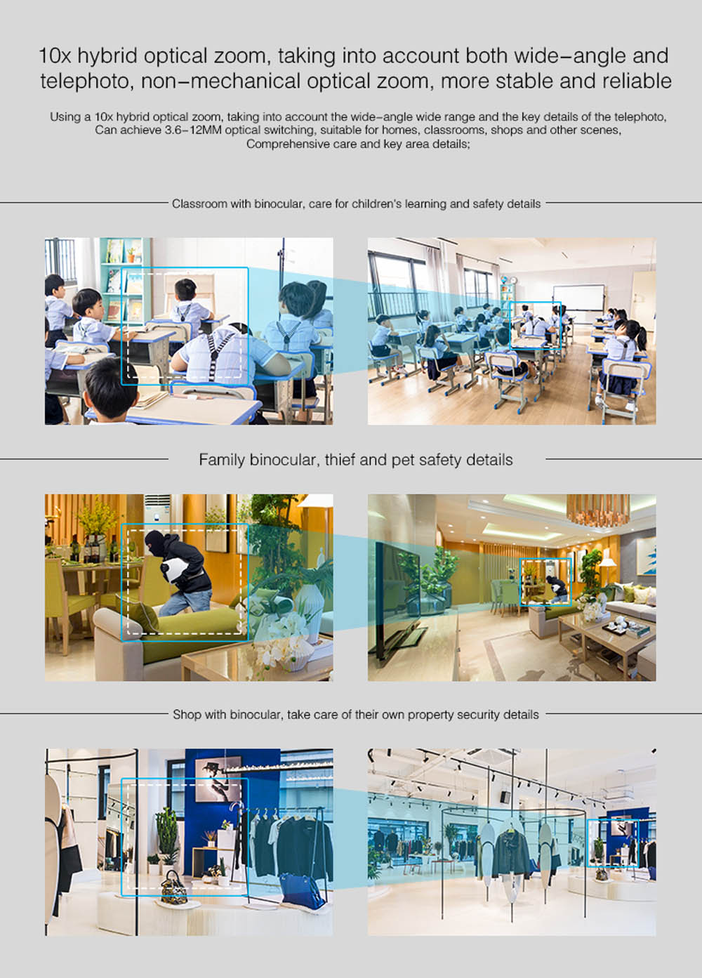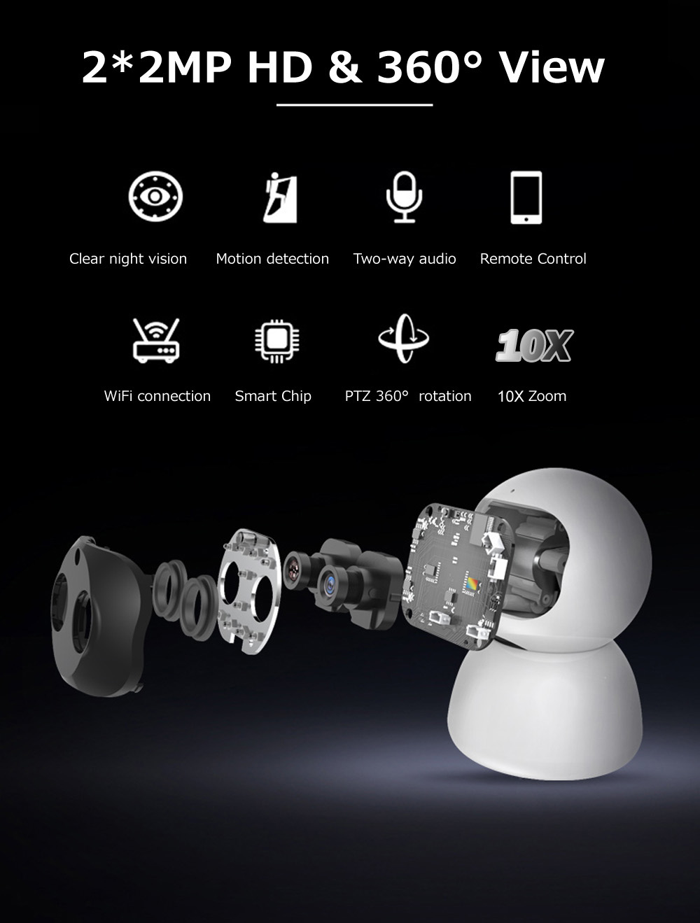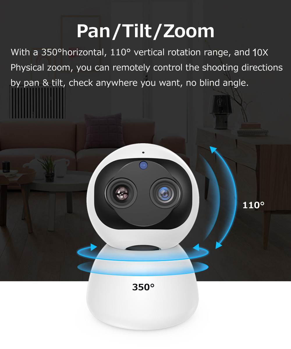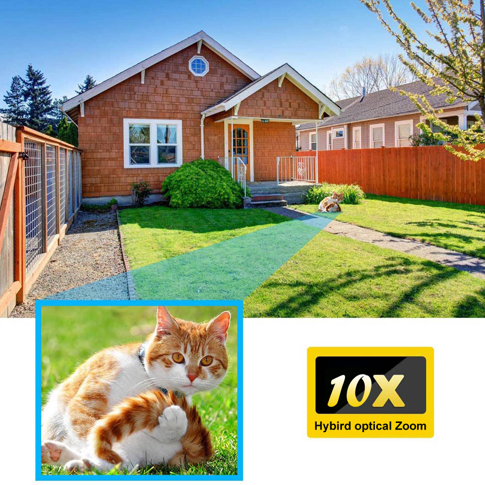 【Smart Pan/Tilt/zoom】обеспечивает 350 ° горизонтальное и 110 ° вертикальное вращение с 10X гибридным оптическим + цифровым зумом для достижения почти 360 ° панорамного просмотра. Покрывайте каждый угол вашего места.