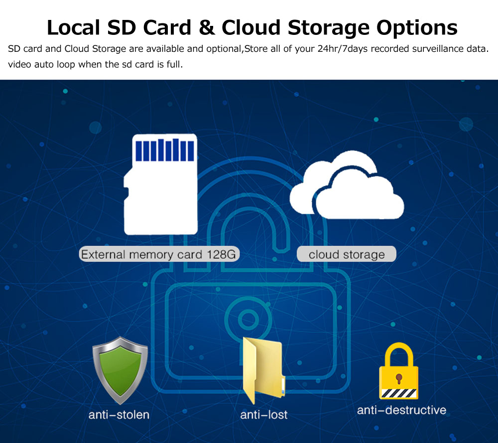 【Два пути хранения 】 sd-карта и Облачное хранилище доступны и опционально, храните все ваши 24 часа/7 дней записи безопасности. Видео будет автоматически циклироваться, когда sd-карта будет заполнена. Он поддерживает ONVIF и совместим с большинством устройств NVR