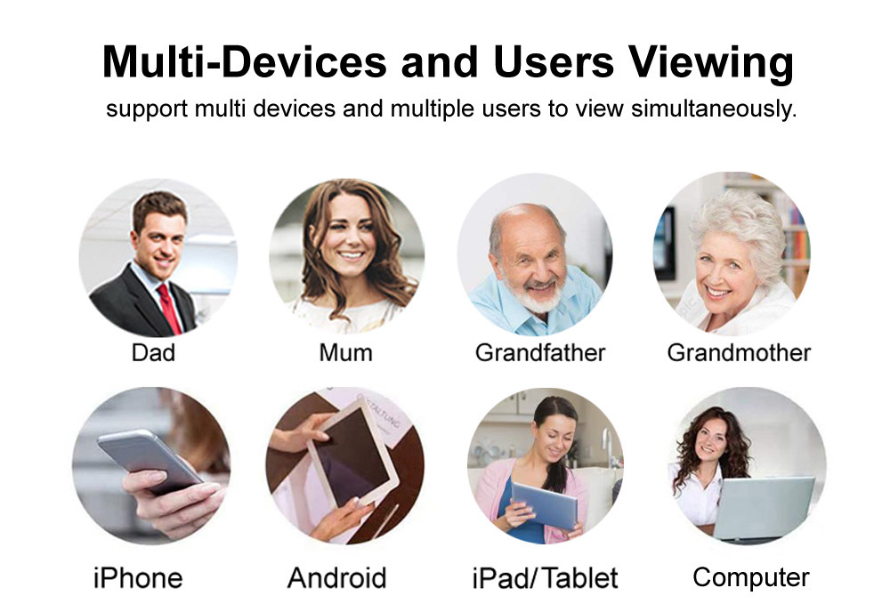 【Многосемейные члены Sharing】 Поддержка нескольких пользователей для одновременного просмотра видео и поддержка нескольких камер устройств в одном приложении для совместного использования.